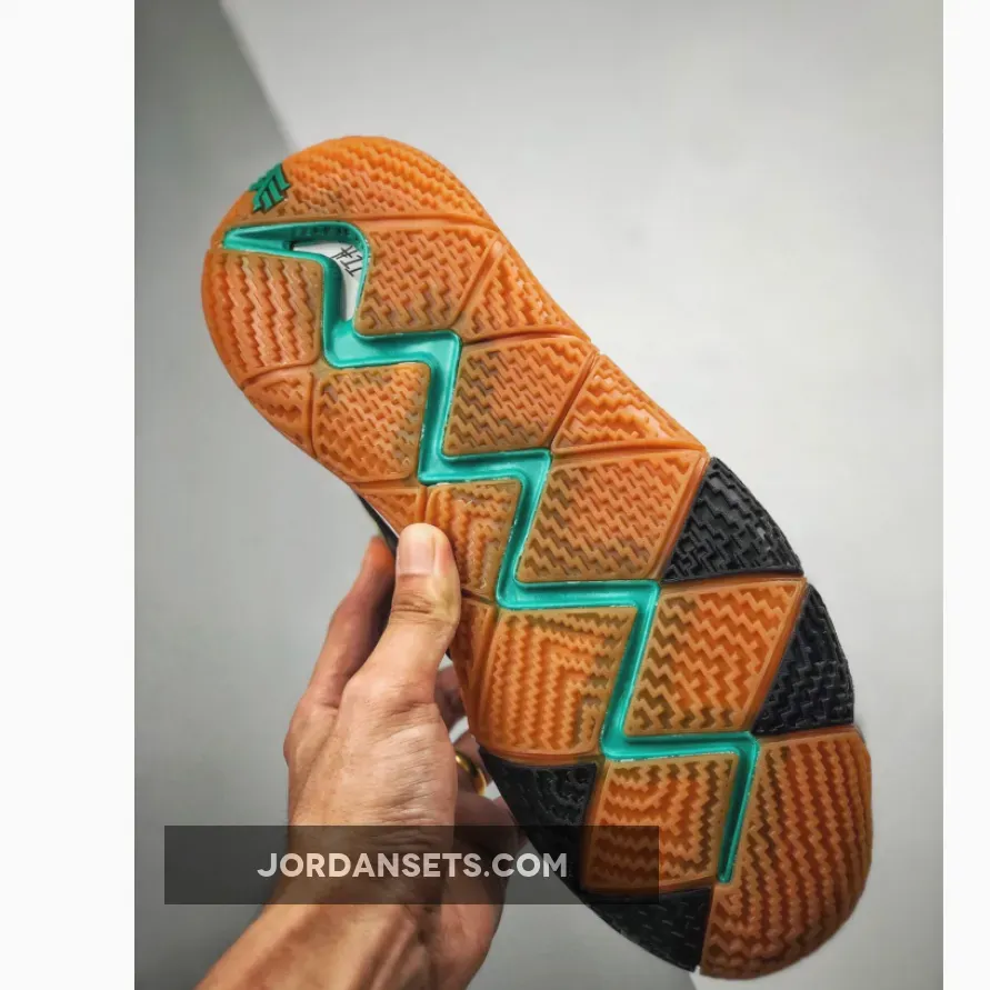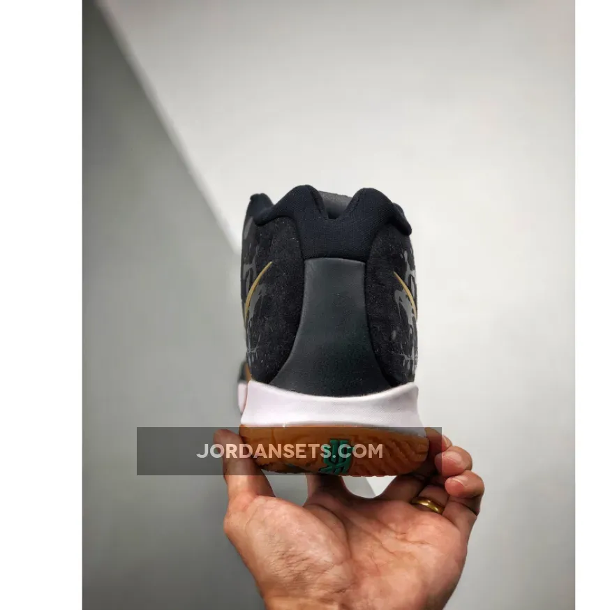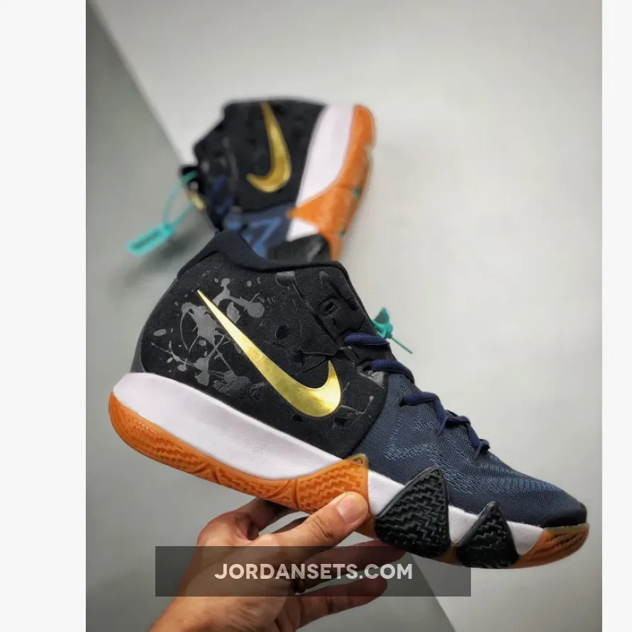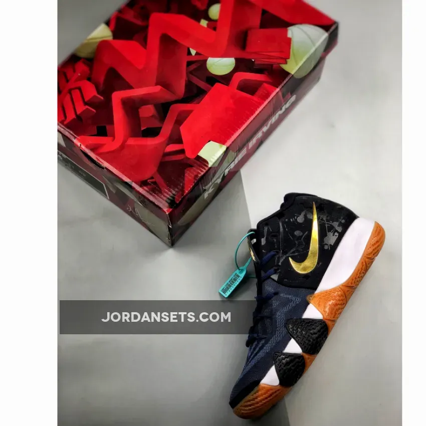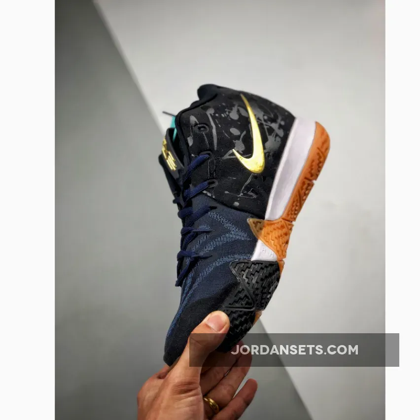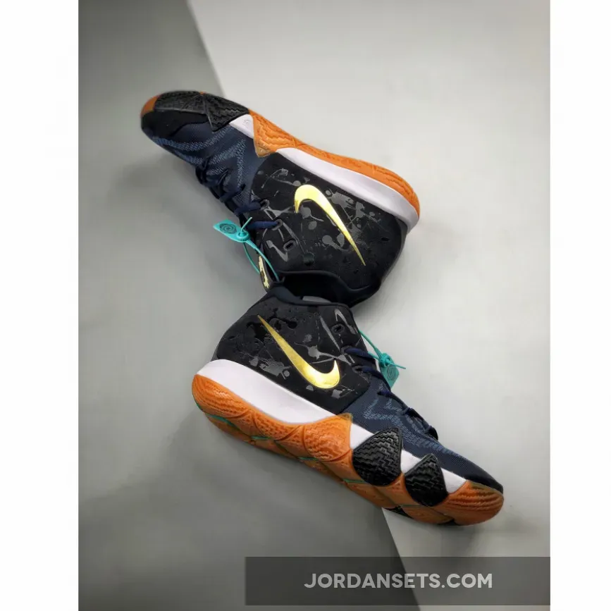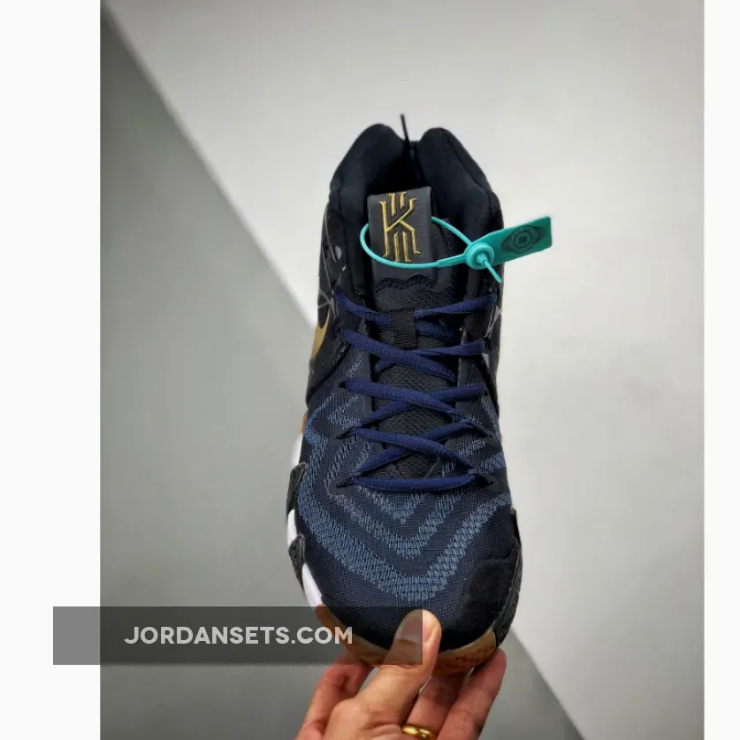 Dressed in a Pitch Blue and Metallic Gold color scheme. This Nike Kyrie 4 comes with contrasting stripes on the toe box and a raised graphic print around the heel. Metallic Gold Nike Swoosh logos, a White midsole, hits of Celtics Green atop a Gum rubber outsole completes the design.