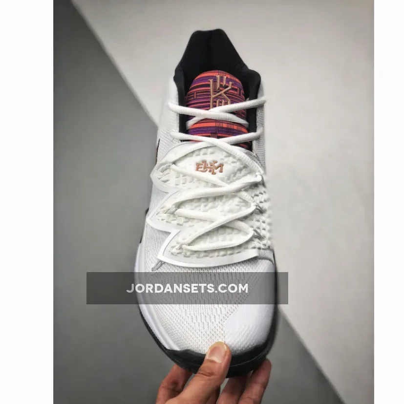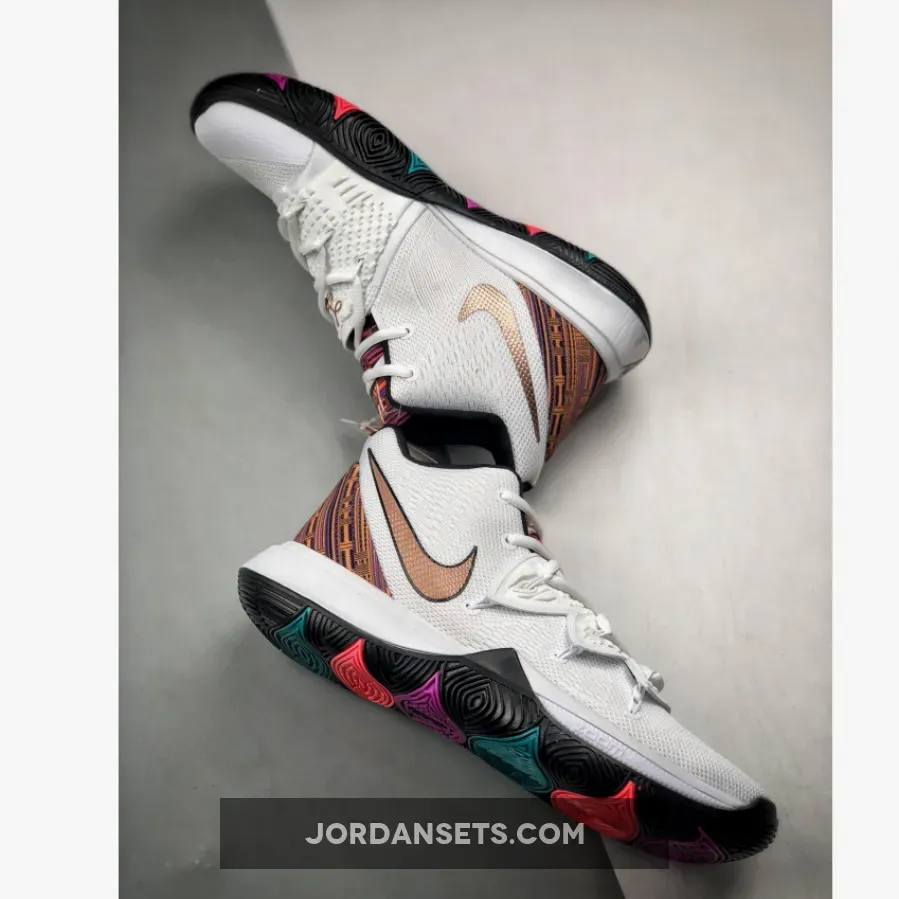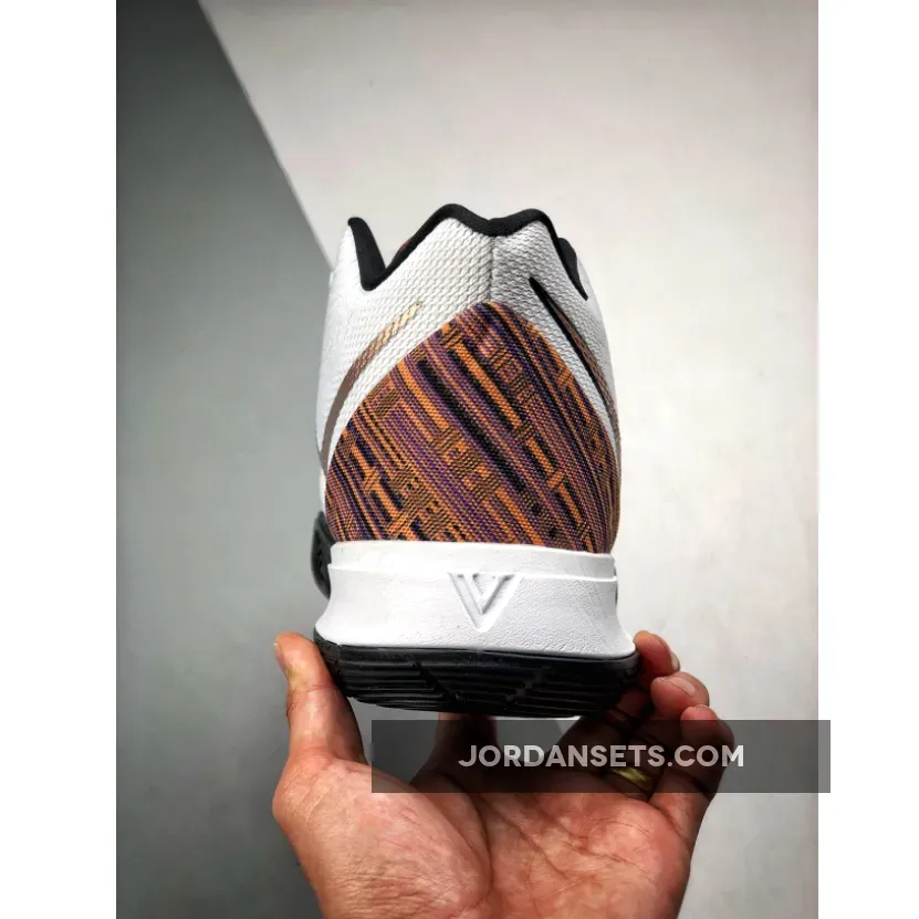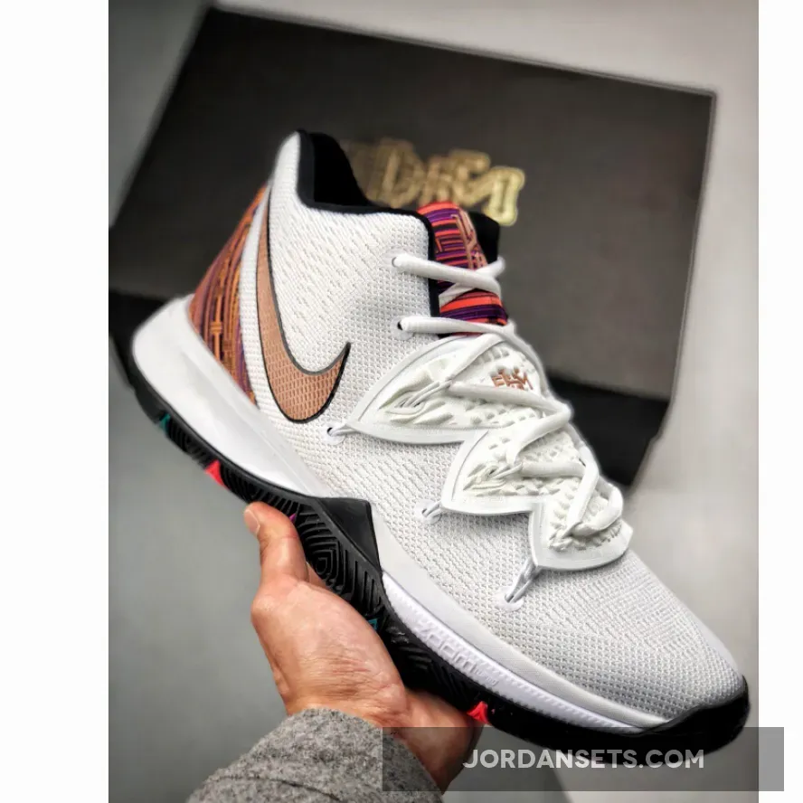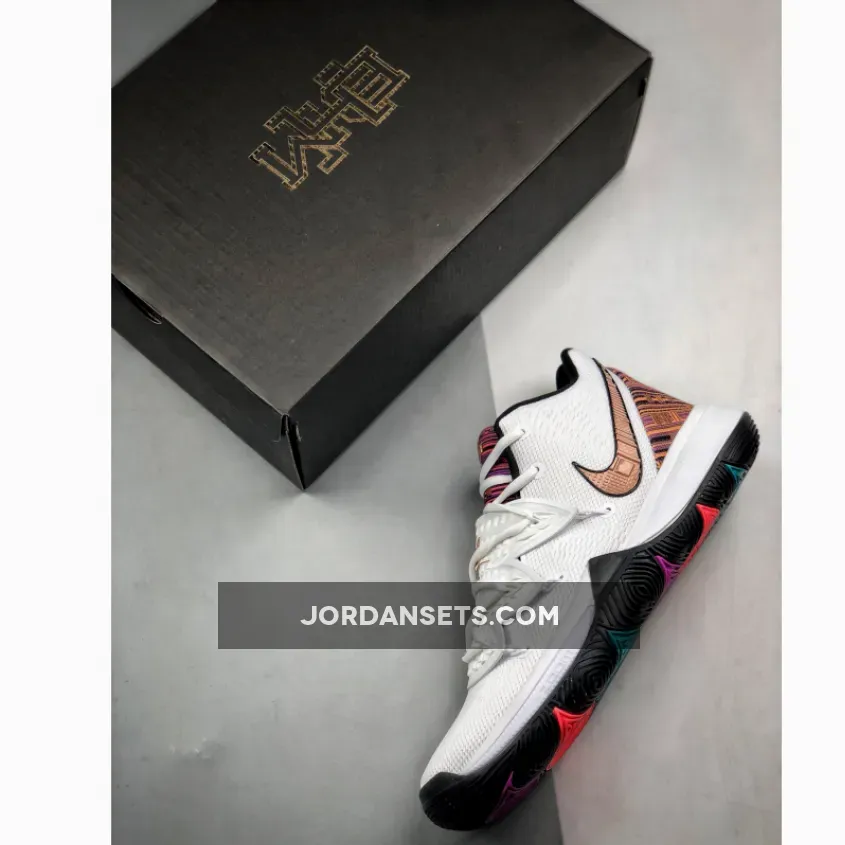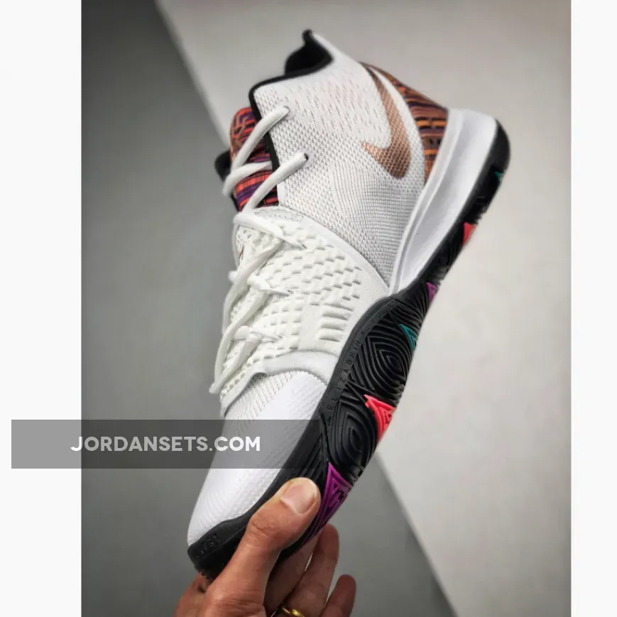 this Nike Kyrie 5 comes dressed in a White and Metallic Red Bronze color theme. This pair is a tribute to Kenyan culture and features a vibrant embossed graphic on the Nike Swoosh, around the heel and tongue. Other details includes Gold branding, Black on the midsole and Multicolor hints on the outsole. Nike Kyrie 5 BHM Color: White/Metallic Red Bronze Release Date: February 1, 2019 Style Number: BQ6237-100 Price: $130