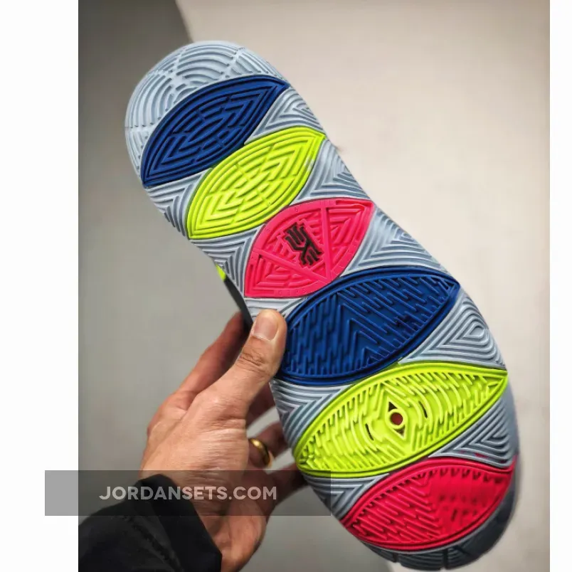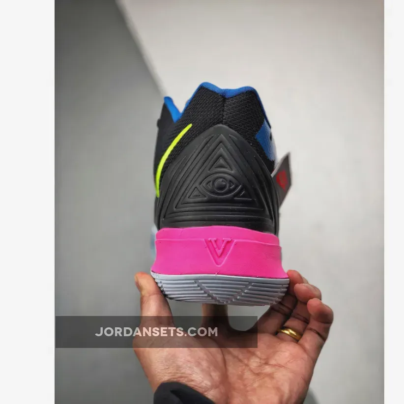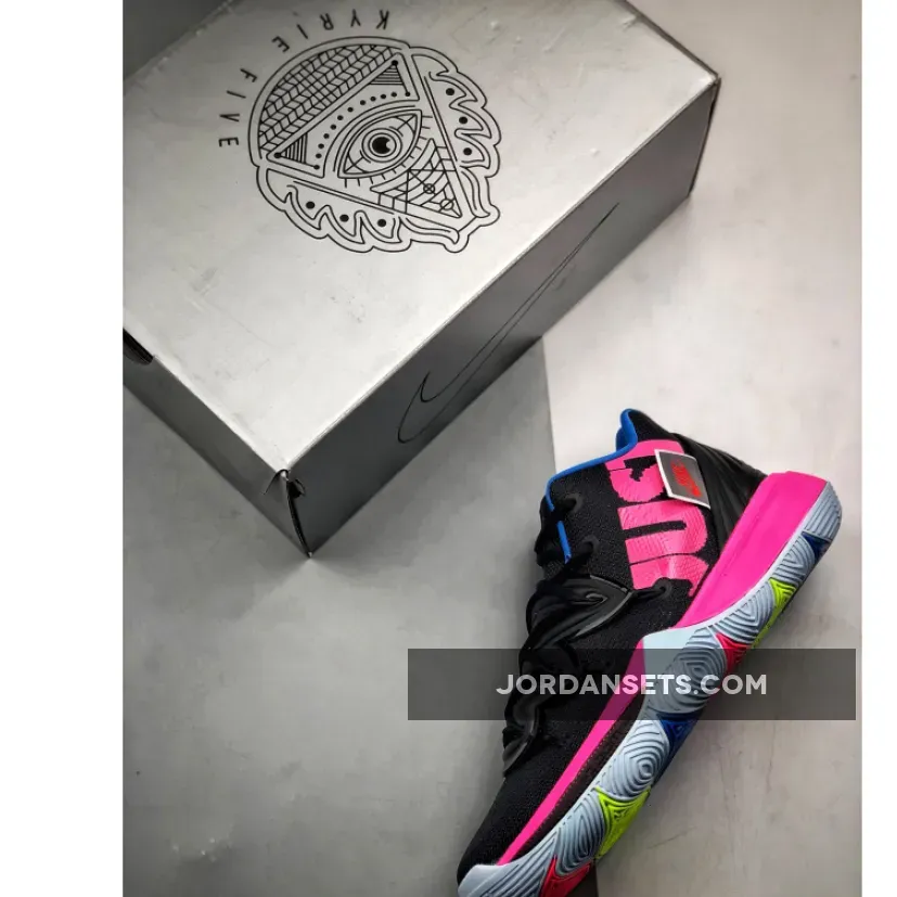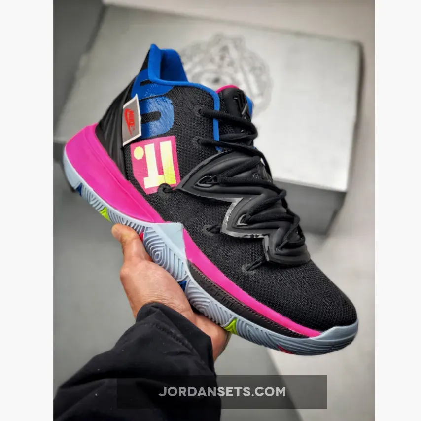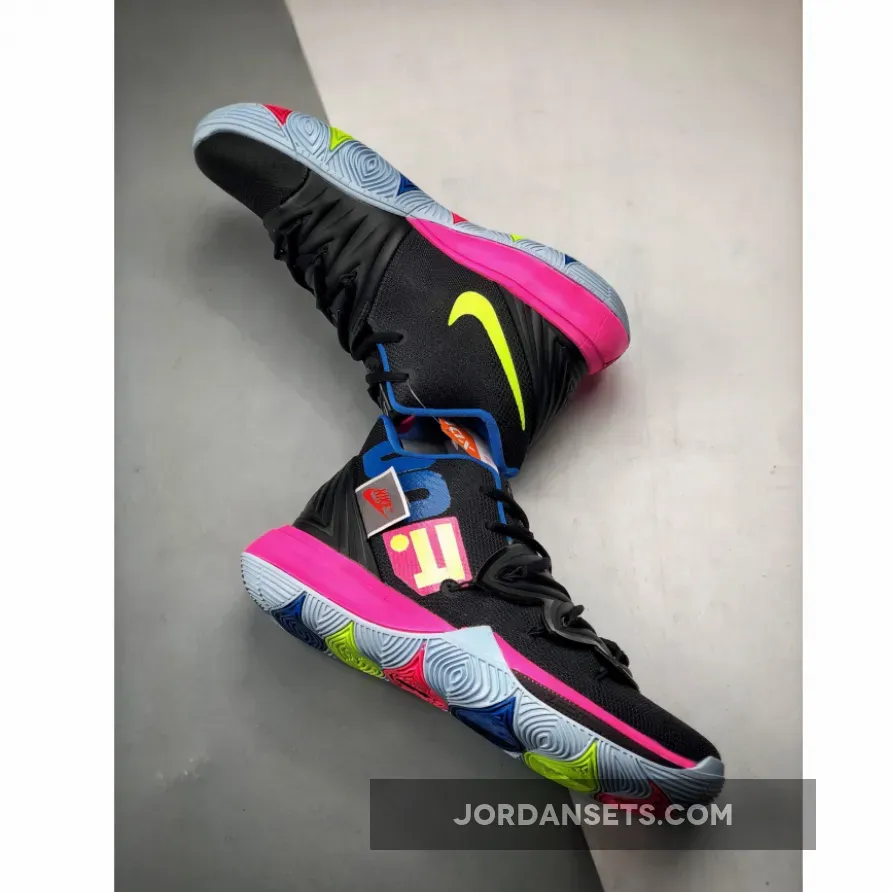 The Kyrie 5 ‘Just Do It’ uses Kyrie Irving’s 5th signature as a wearable billboard for Nike’s long-running slogan. In keeping with its late ‘80s origins, the tagline is rendered in Reagan-era dayglo hues, contrasted against the backdrop of a black engineered mesh upper. A Hyper Pink finish on the midsole is complemented by a multi-color outsole, which curves up the sidewalls to provide traction during quick cuts.