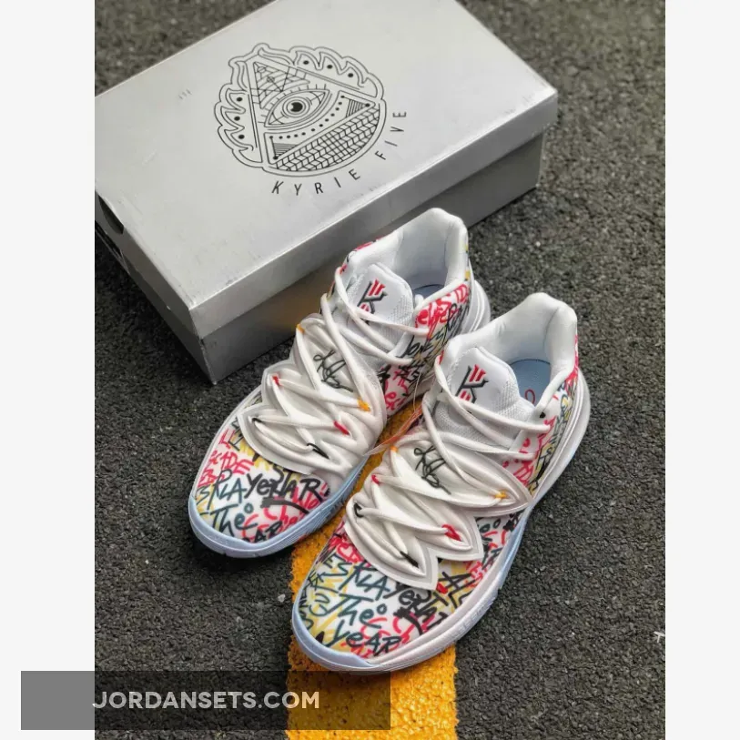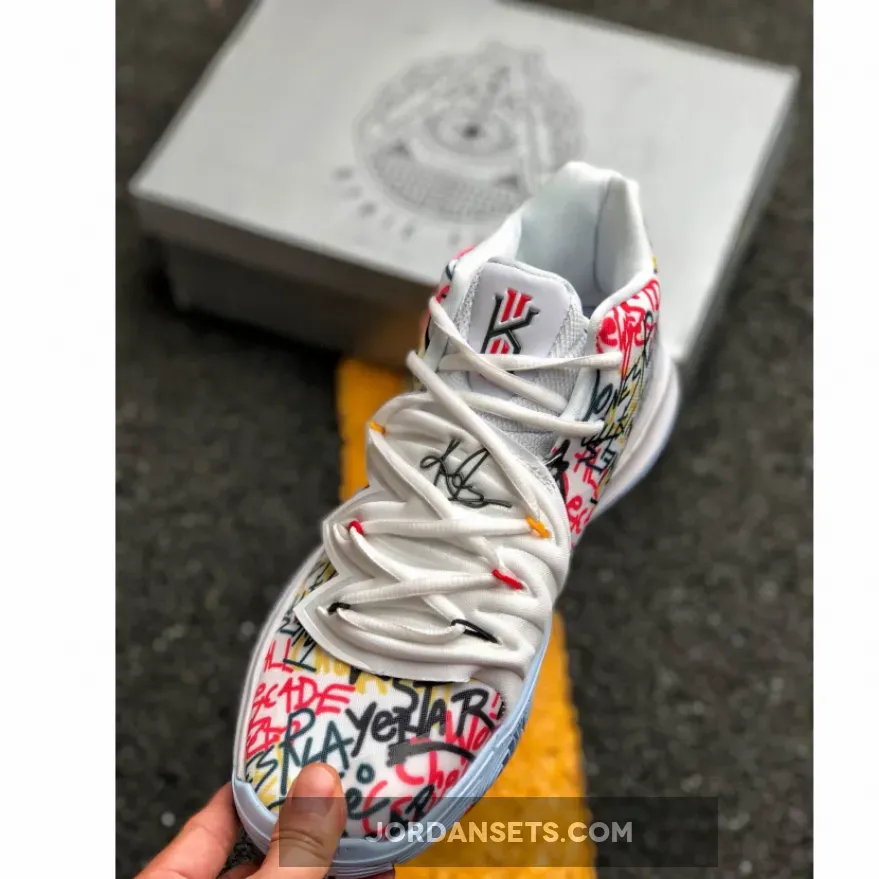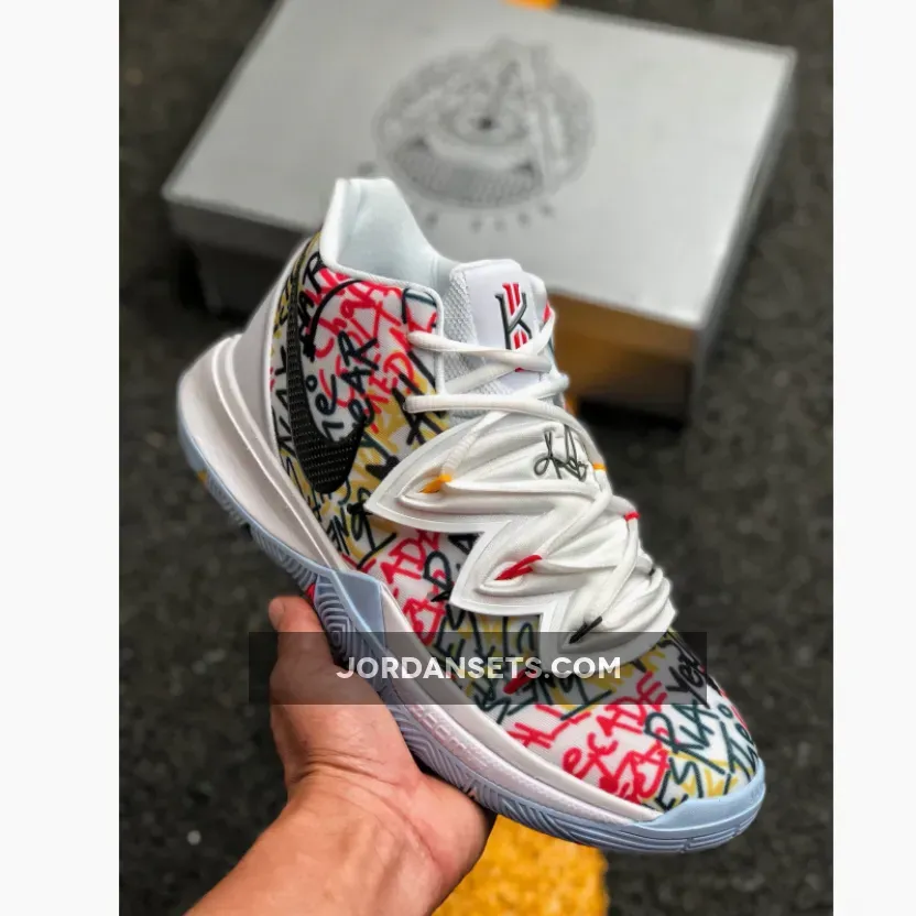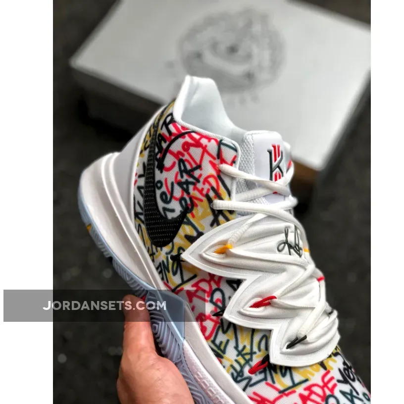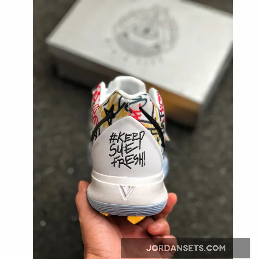 This offering of the Kyrie 5 will be available in grade school and men’s sizing. It features a White-based upper covered in a colorful text throughout the shoe including a hashtag that reads, “Keep Sue Fresh.”