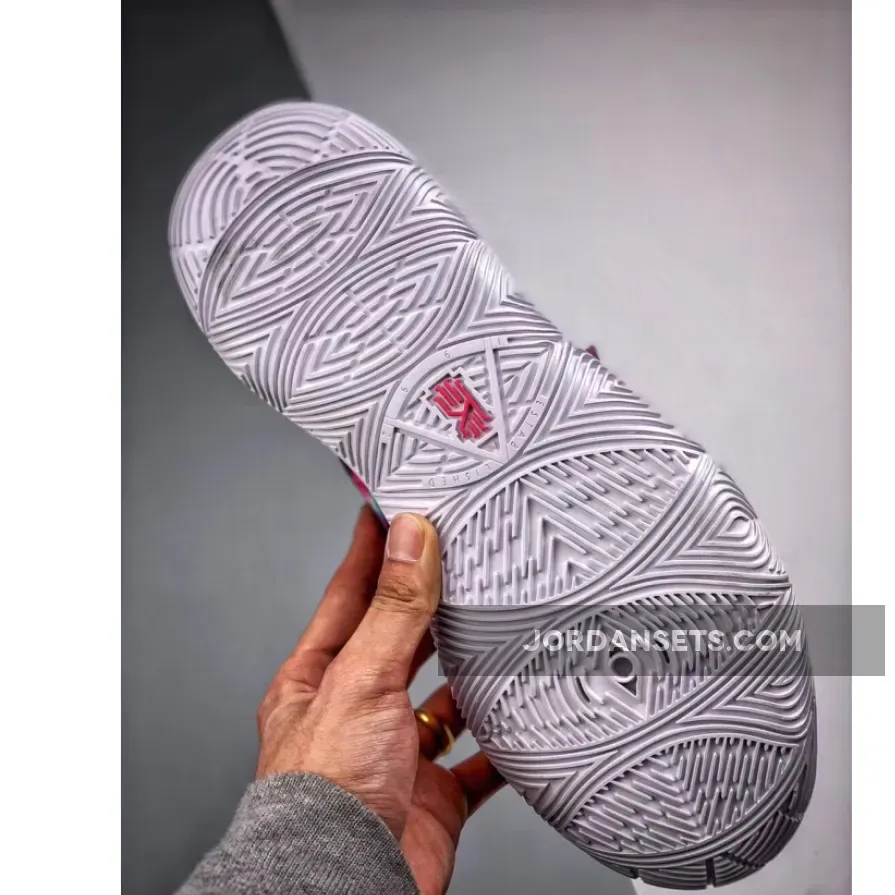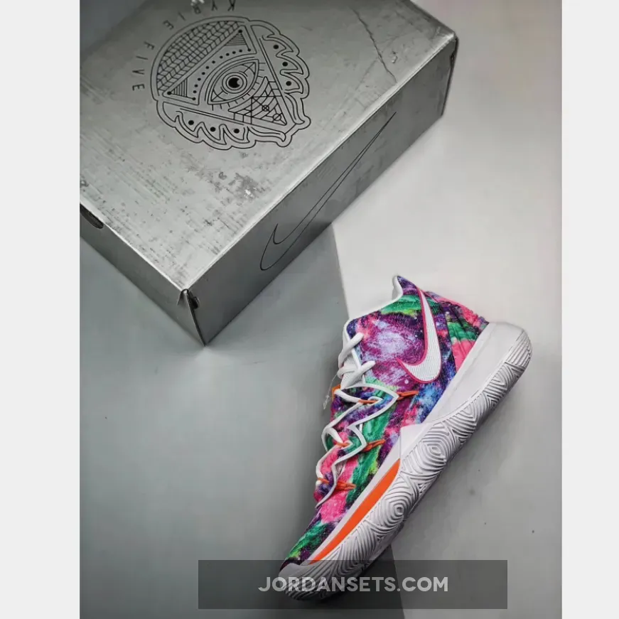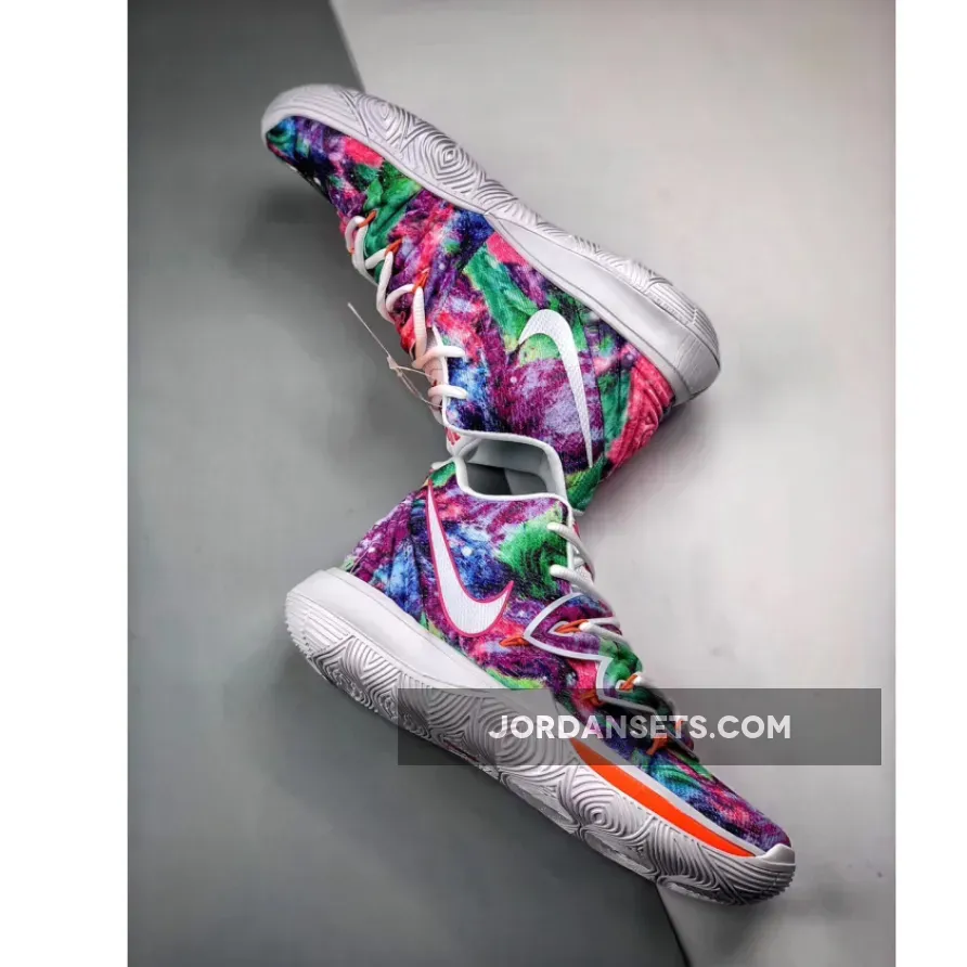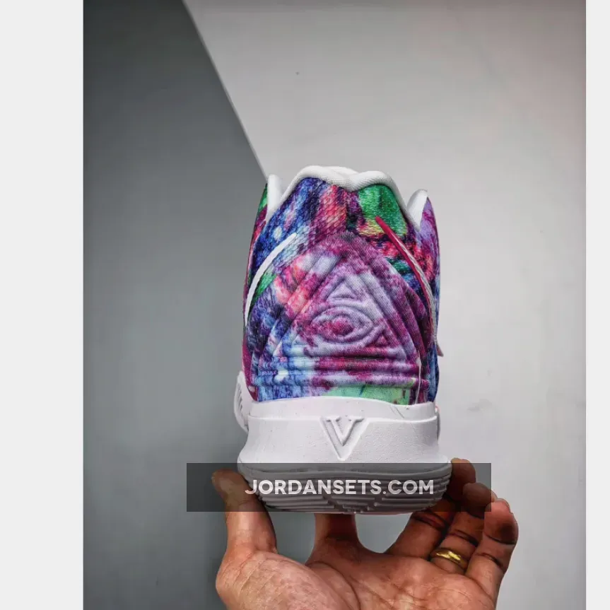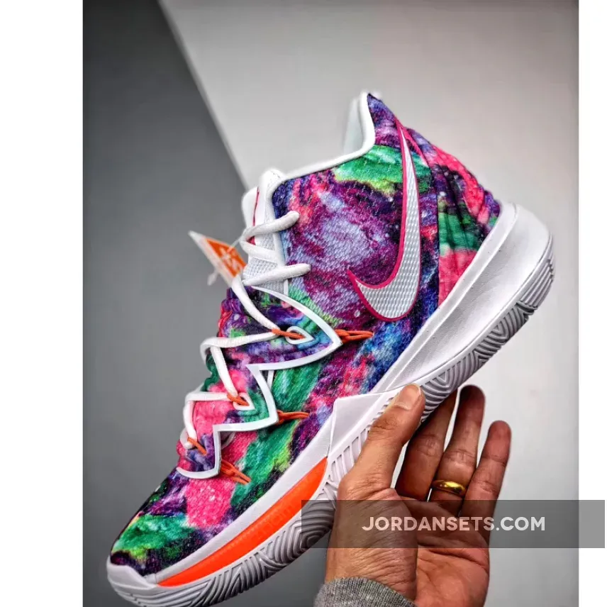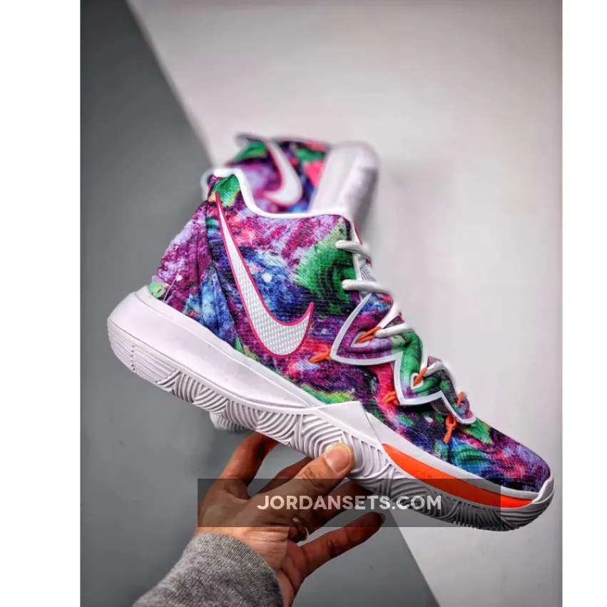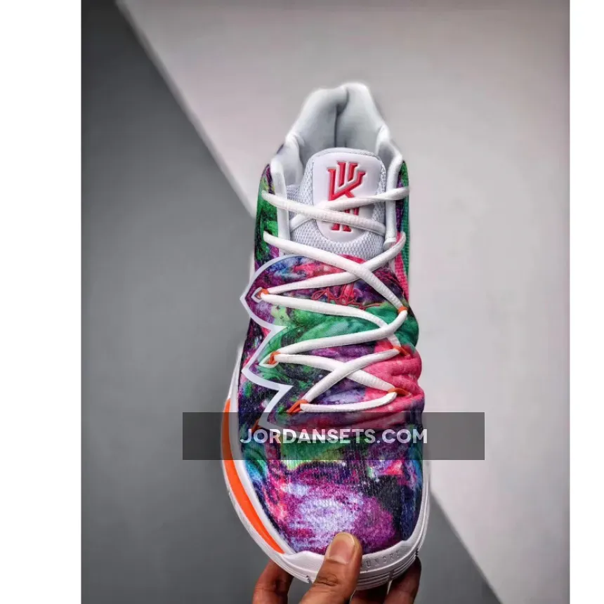 This iteration of the Nike Kyrie 5 features a mix of dyed colors on the upper while having White on the lining, tongue, and sole.