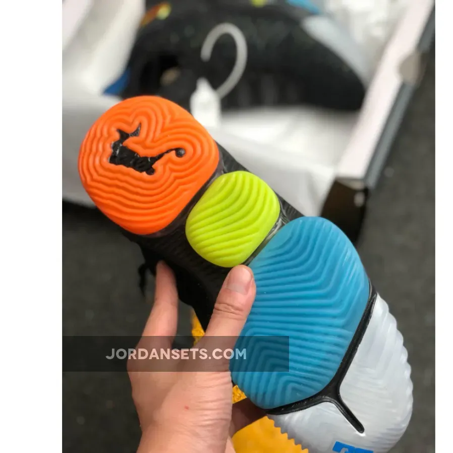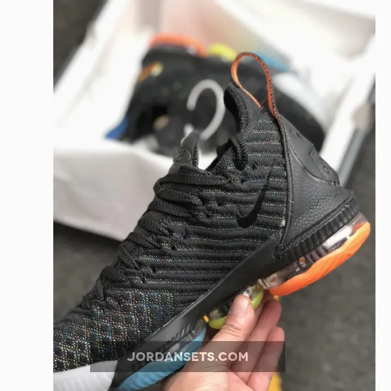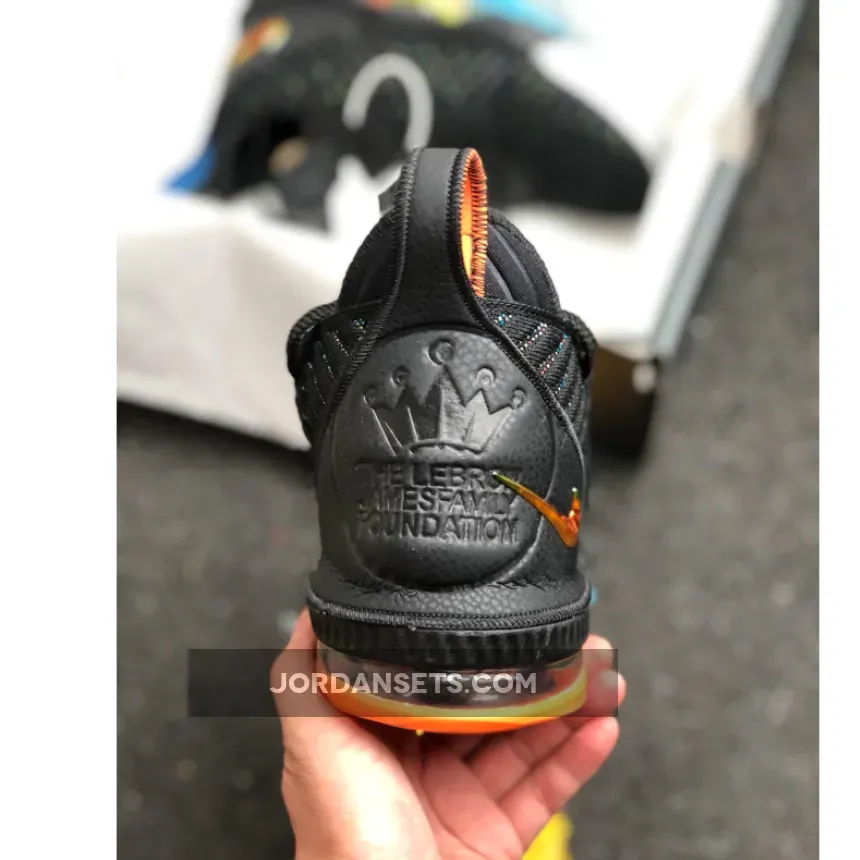 This Nike LeBron 16 is inspired by his children and the I Promise school that opened up earlier this summer in Akron, OH. The shoe features a Black Battleknit 2.0 upper with Multicolor colors on the underlay atop an outsole that represents his family. Finishing off the theme is a “WE ARE FAMILY” message on the leather heel wrap.
