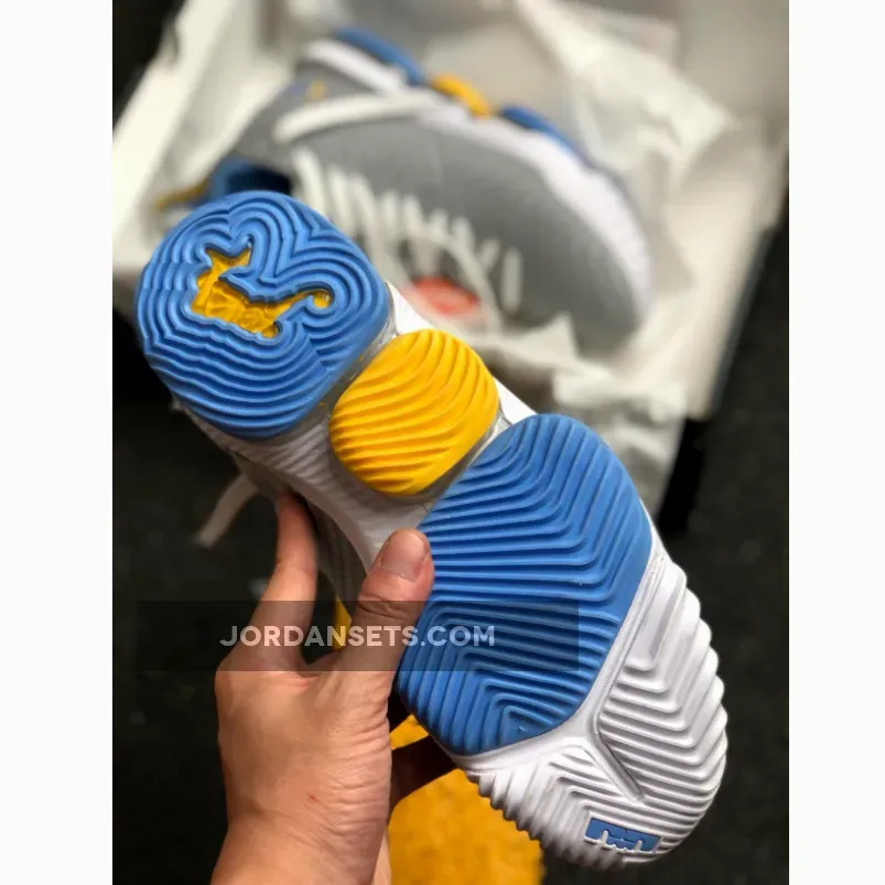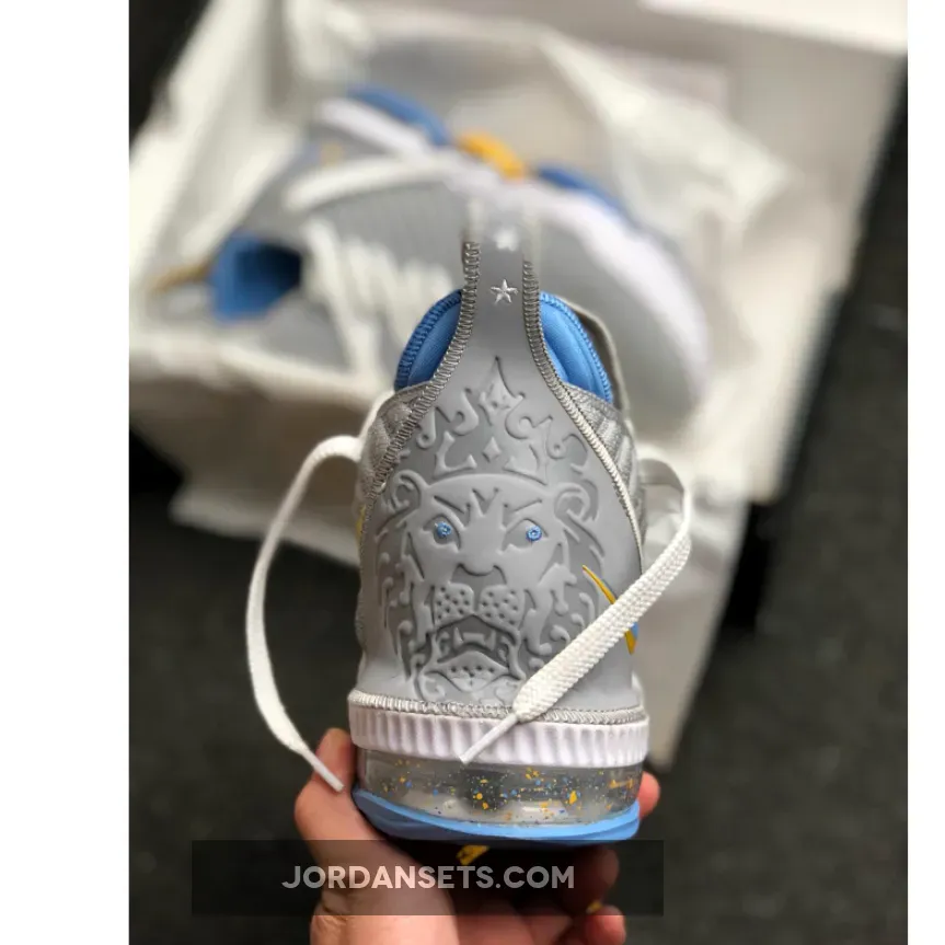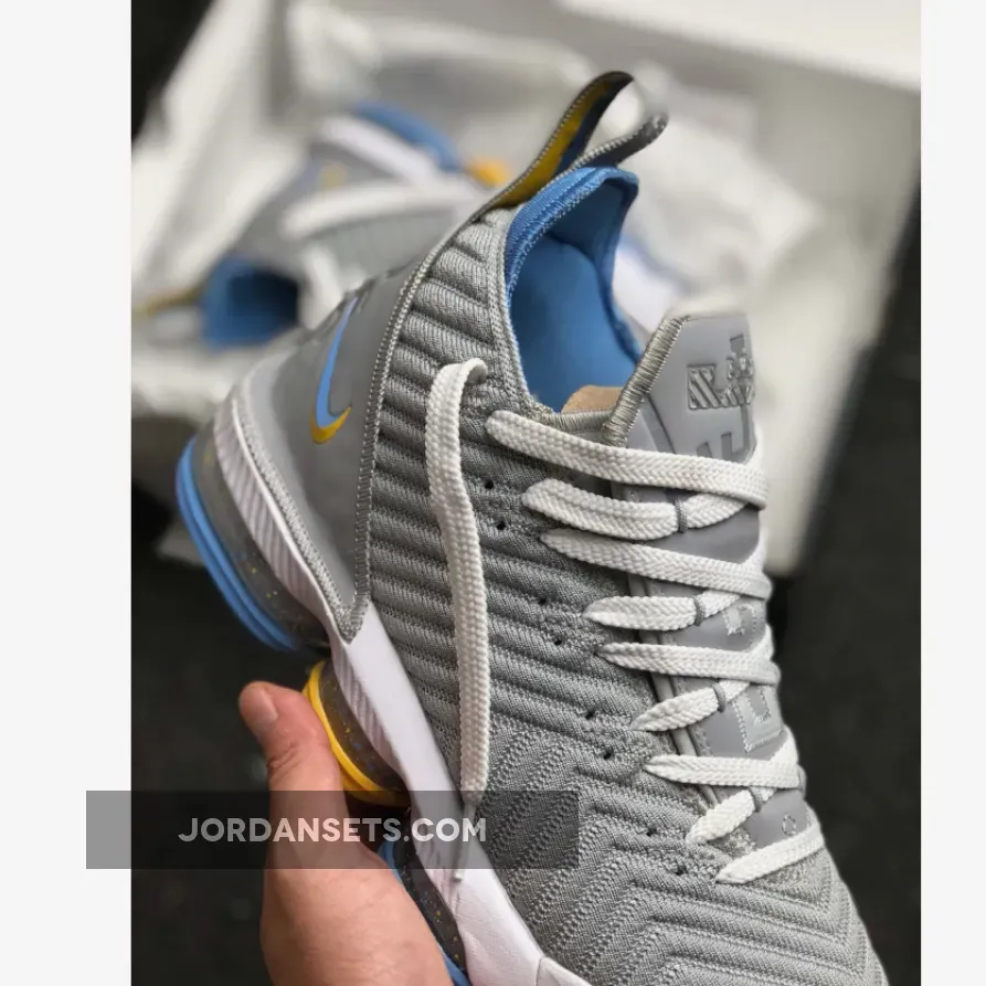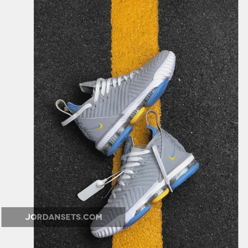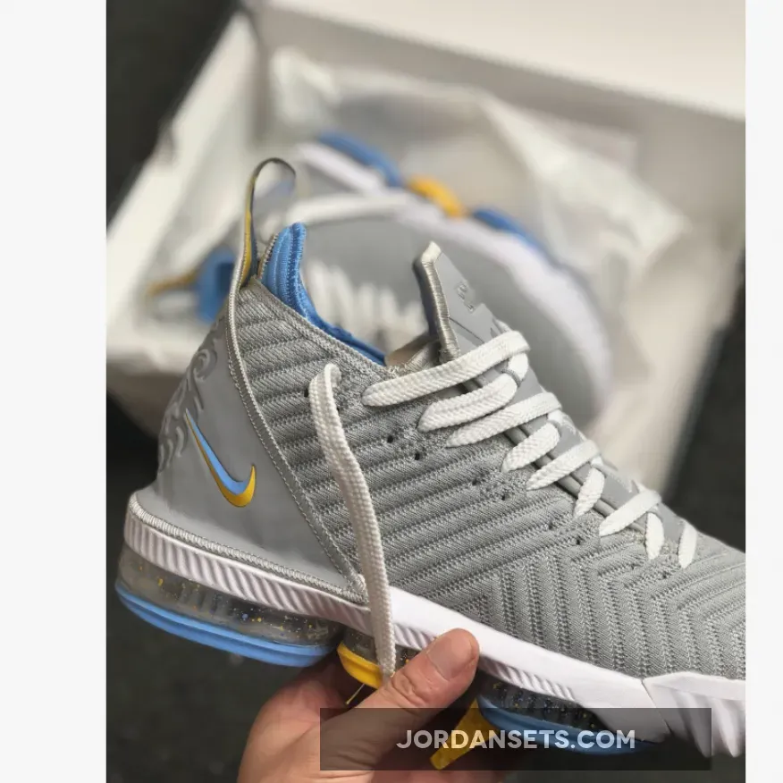 Its color scheme is a nod to the Minneapolis Lakers uniforms from the ’50s, this Nike LeBron 16 features a mix of Grey hues on its upper, tongue and heels. Giving off that MPLS vibe are Blue and Gold contrasting accents throughout.