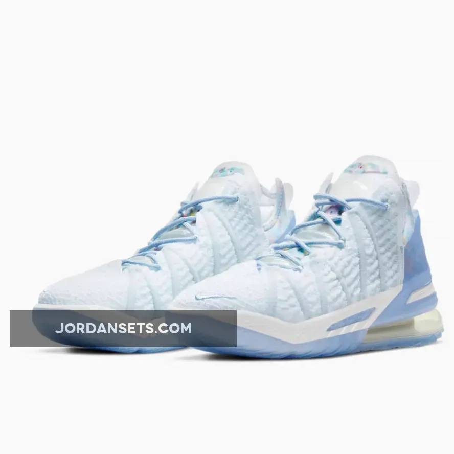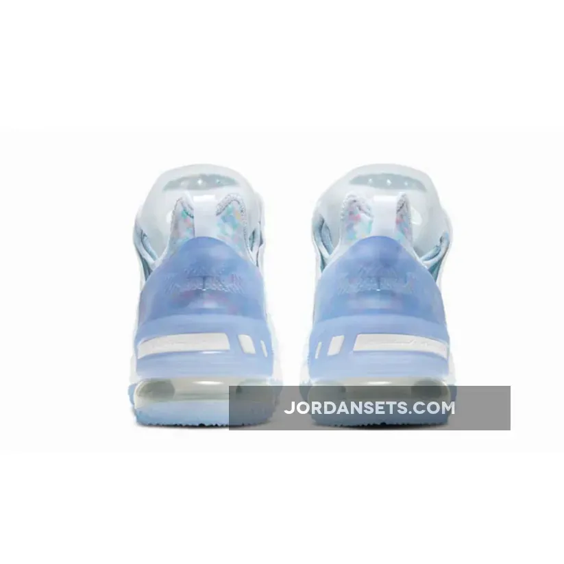 Dressed in a Blue Tint, White, and Clear color scheme. This Nike LeBron 18 features a White knitted upper paired with icy clear details in the rear. Multicolored patterns are found on geometric elements at the tongue and heel completed with an icy translucent outsole.