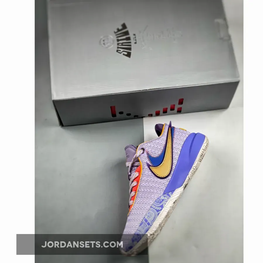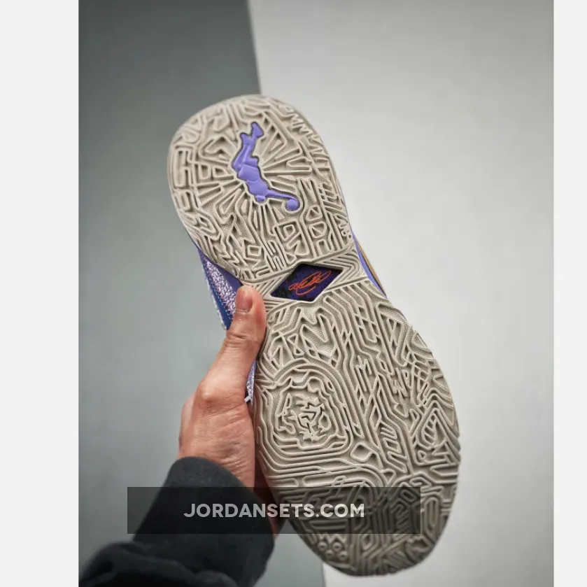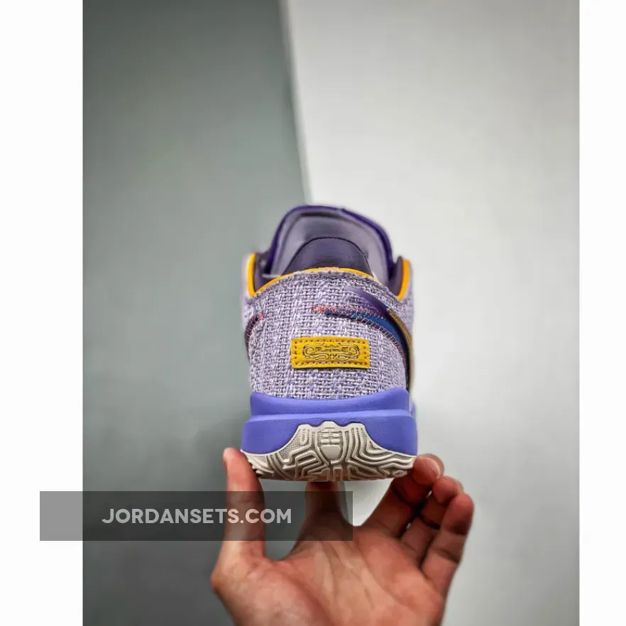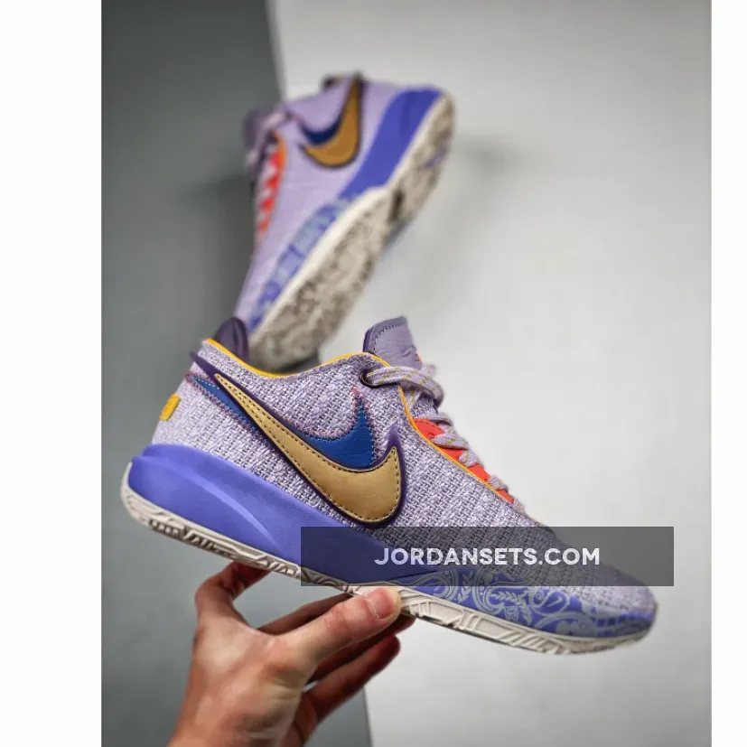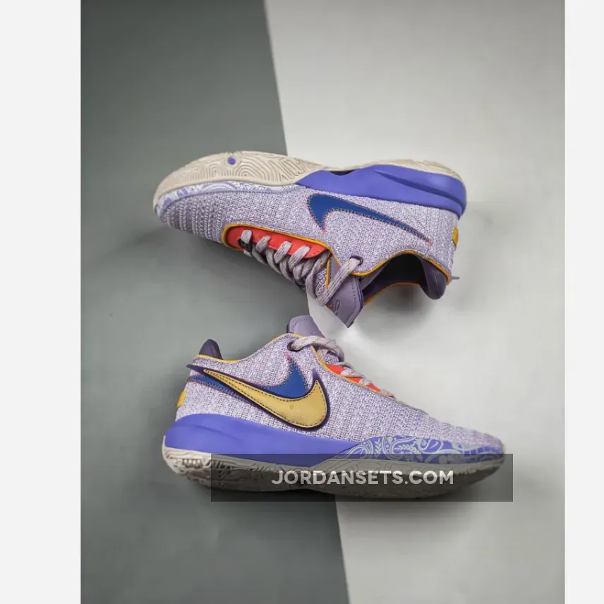 The newly-debuted Nike LeBron 20 is quickly rolling out new colourways. Take a closer look at the Nike LeBron 20 Violet Frost.This fanciful LeBron 20 has a purple woven mesh upper. The eye stay panels are contrasting muted red with a safari animal print. Golden yellow cuff lining joins the mix on the upper part of the shoe. The oversized tongue is edged with Violet Frost tumbled leather. The signature profile Swooshes are doubled on the lateral side, the first layer blue and the outer layer golden yellow. On the medial side is a single blue Swoosh. A stylised white tread with illustrations of the King James lion and LeBron’s iconic reach-back dunk silhouette finishes off the style of these kicks.