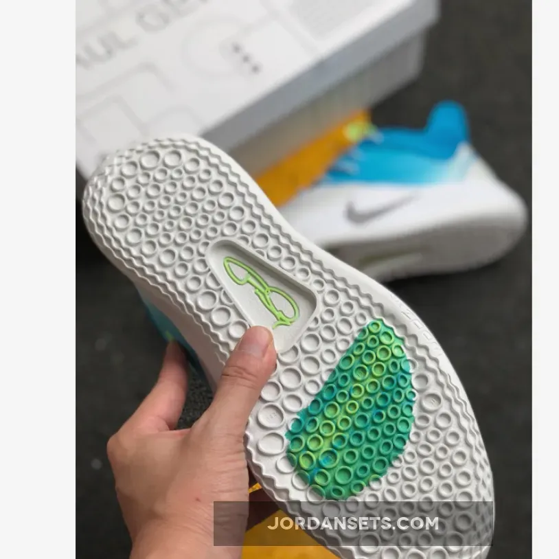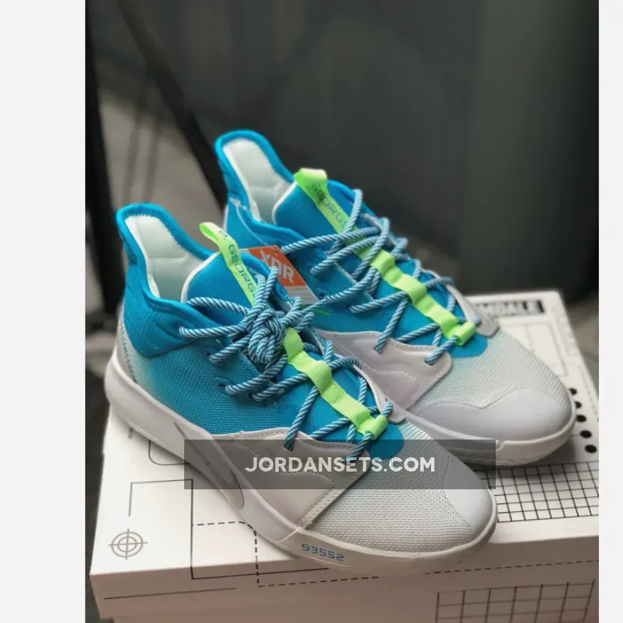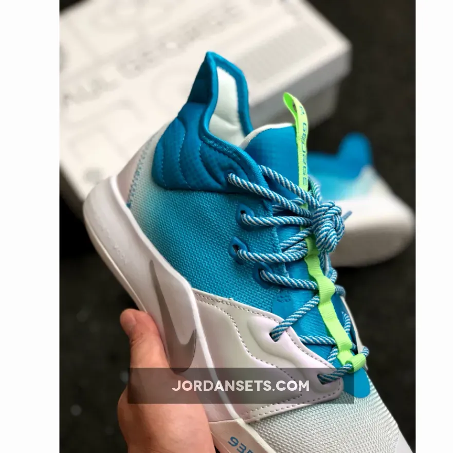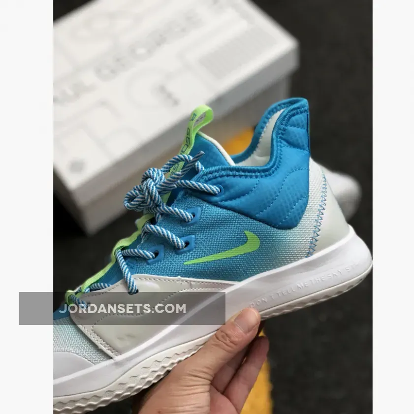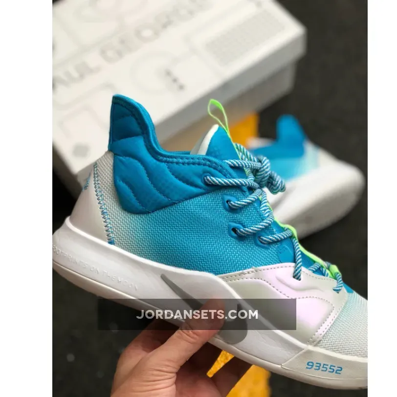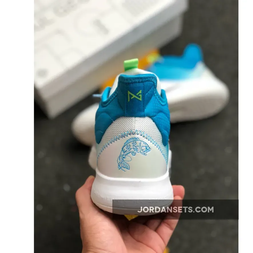 Dressed in a combination of water-themed color tones. This Nike PG 3 features a White mesh upper with Aqua Blue and Bright Green accents throughout. Finishing off the design is a Light Grey Swoosh on the midsole and a fish logo embroidered on the heel.