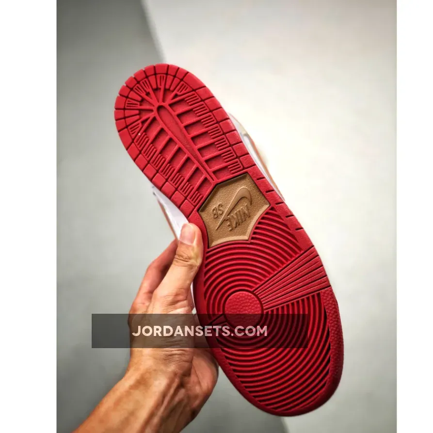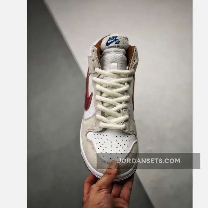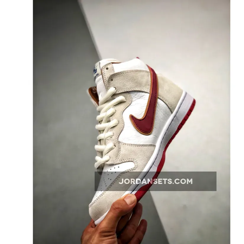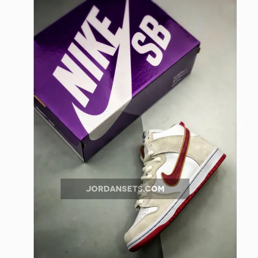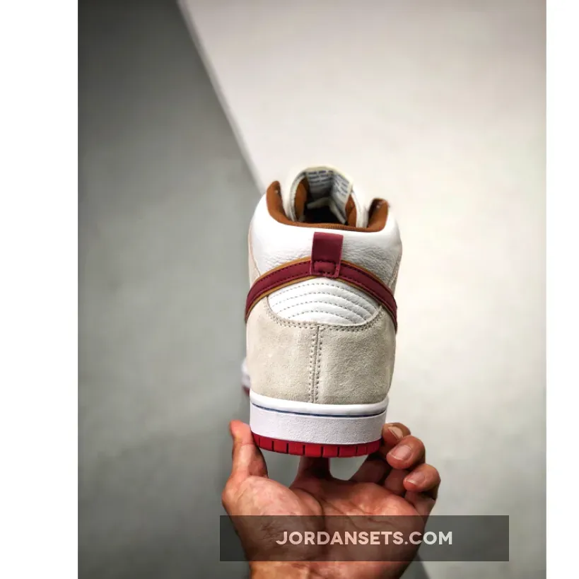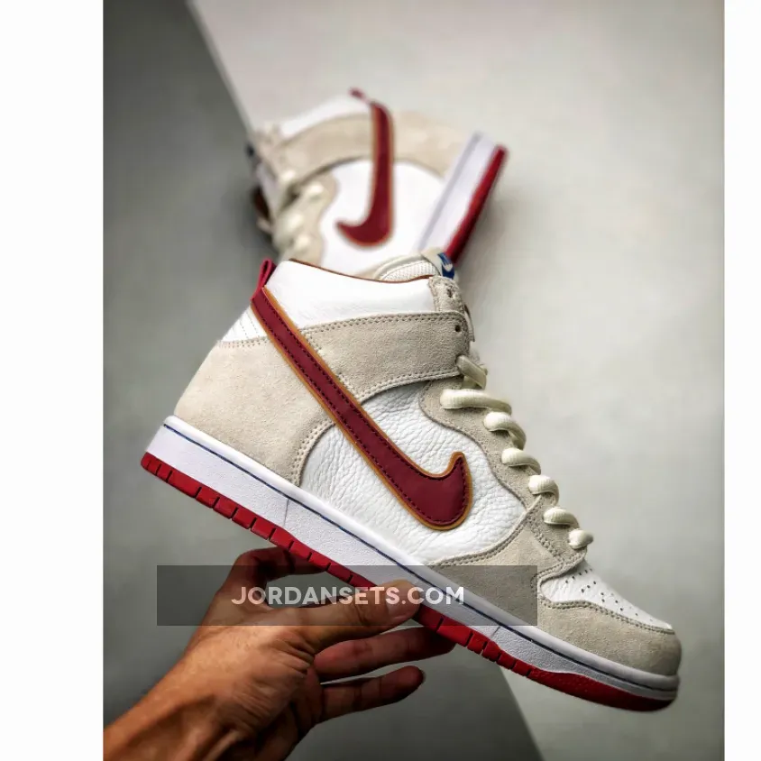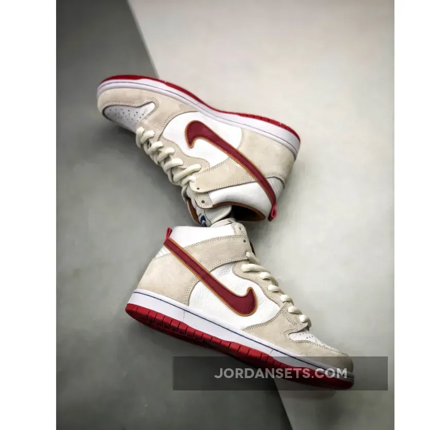 This offering of the Nike SB Dunk High comes dressed in a Sail, Wheat, and Team Crimson color scheme. It features a tumbled leather upper paired with suede overlays, mesh tongues and Crimson Red accents on the liner, Swooshes, heel tab and rubber outsole.
