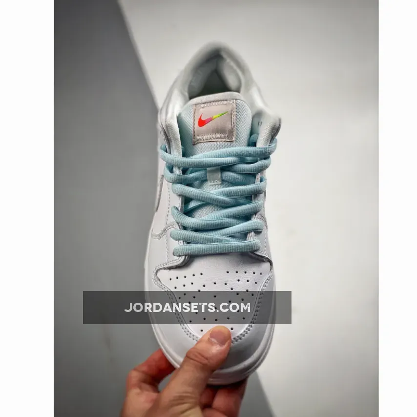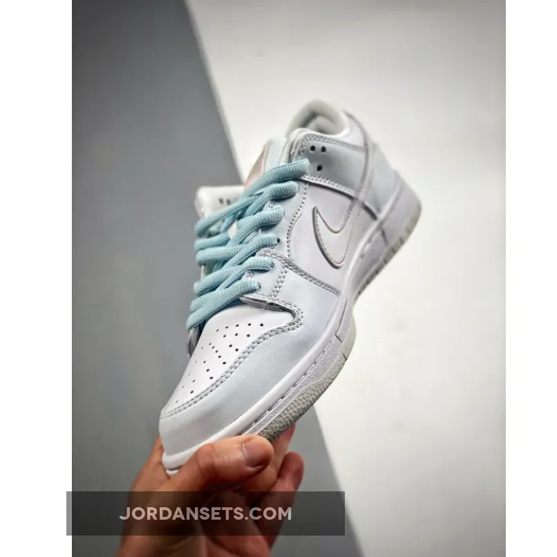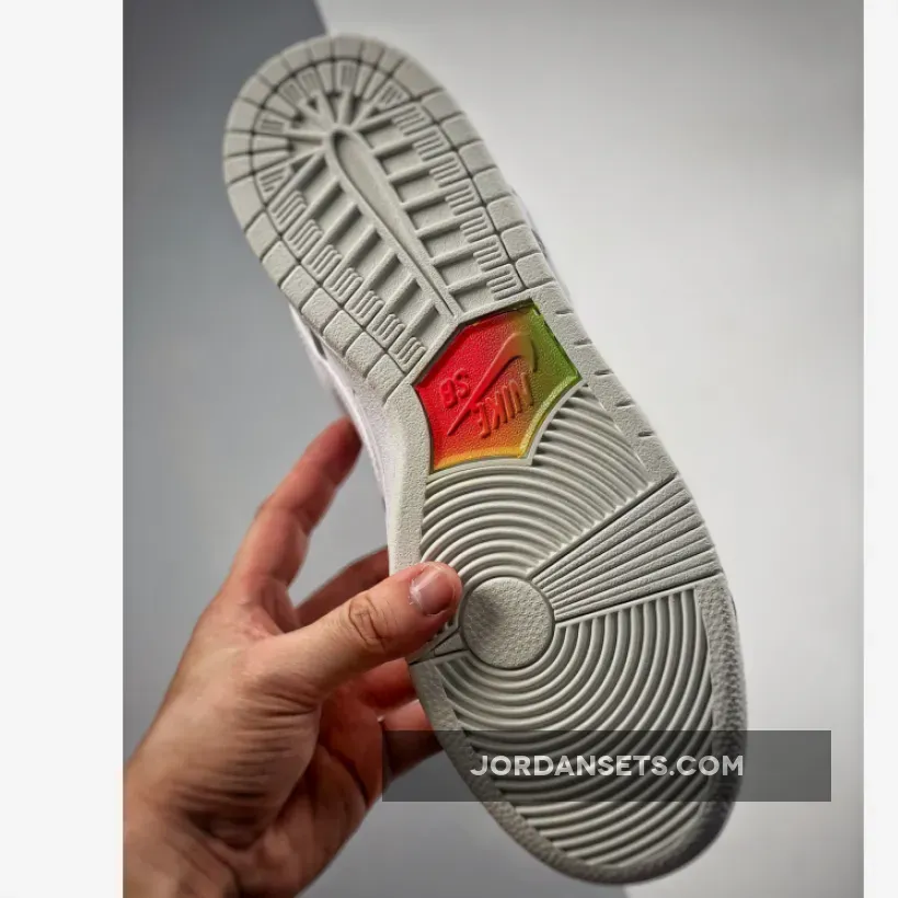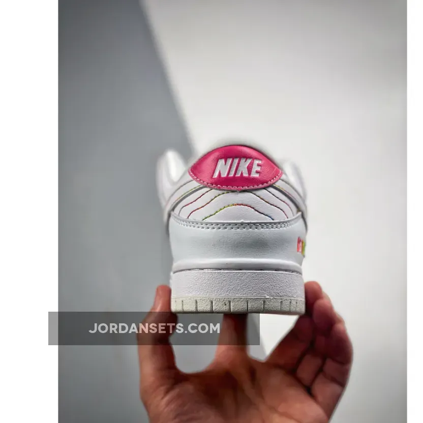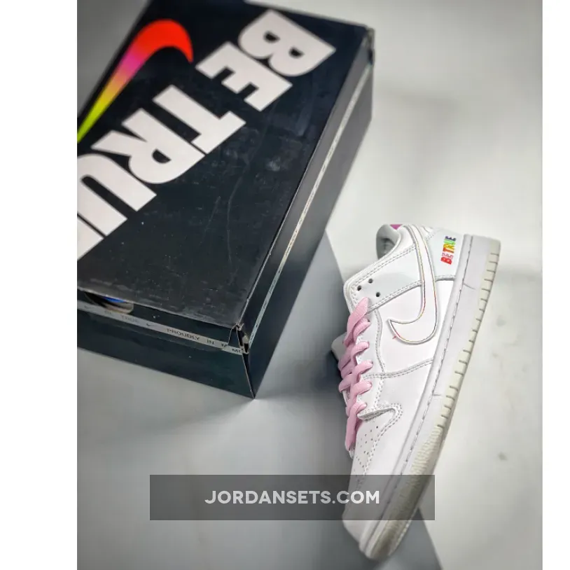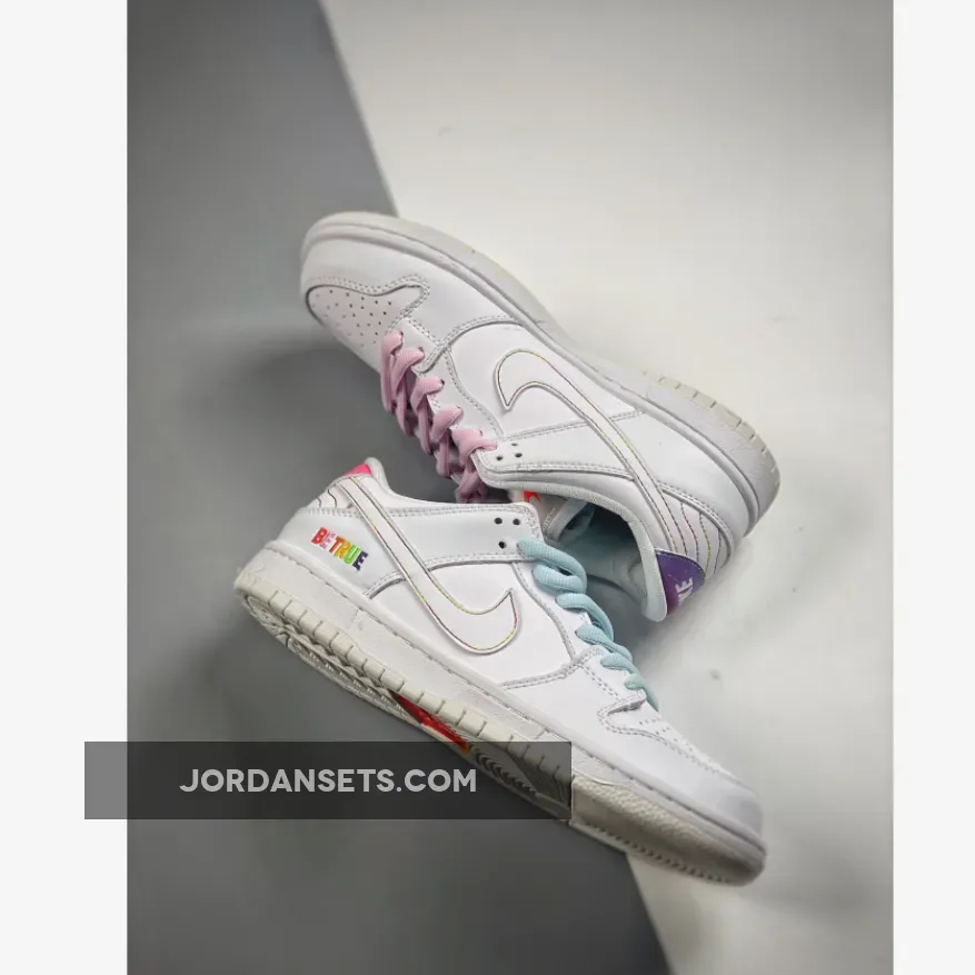 This offering of the Nike SB Dunk Low features a White leather base with wear-away overlays that changes colors in the sun. Other details includes a zippered stash pocket on the tongue and “BE TRUE” embroidered in rainbow colors on the lateral heel. Mismatching Yellow and Green heel panels, gradient Swooshes on the outer and inner tongue tags, stitching, insoles, and outsole plate atop a solid White rubber sole completes the design.