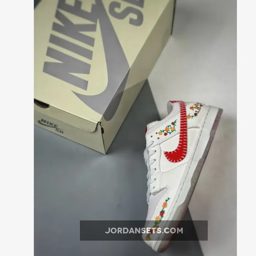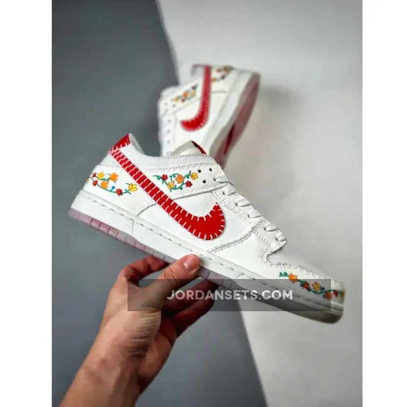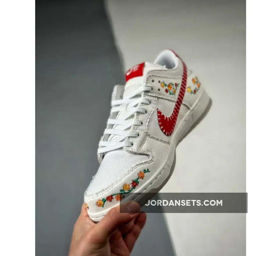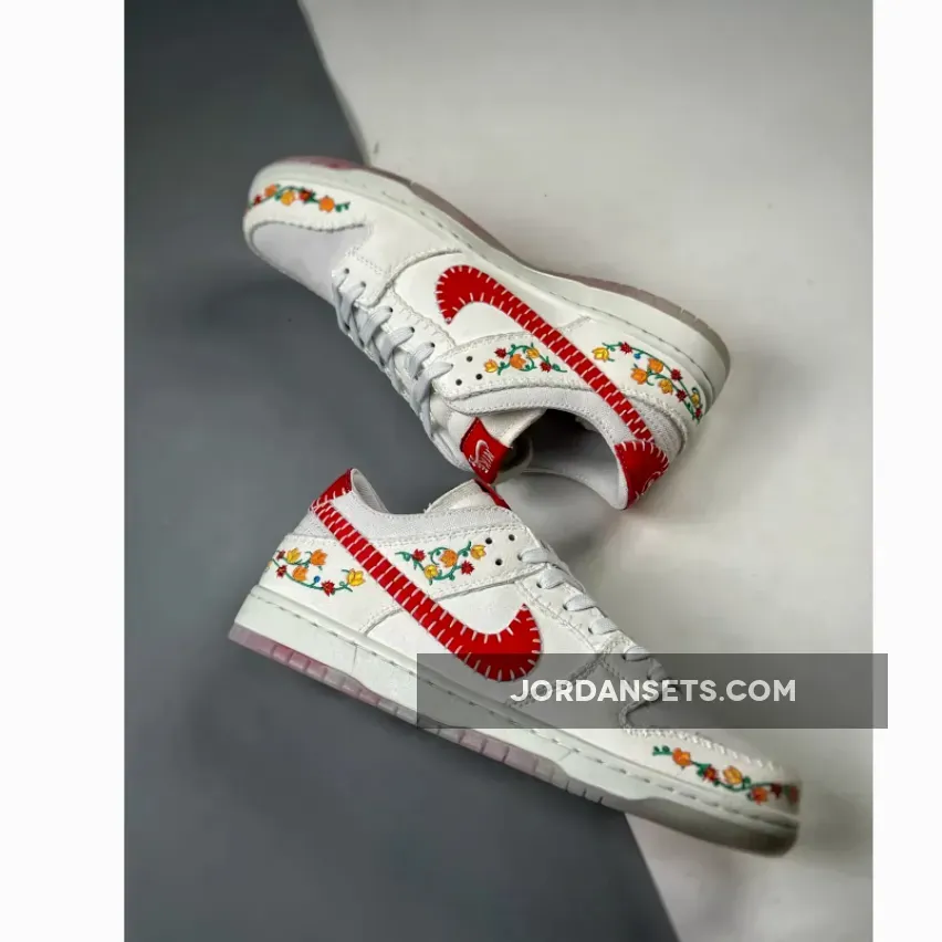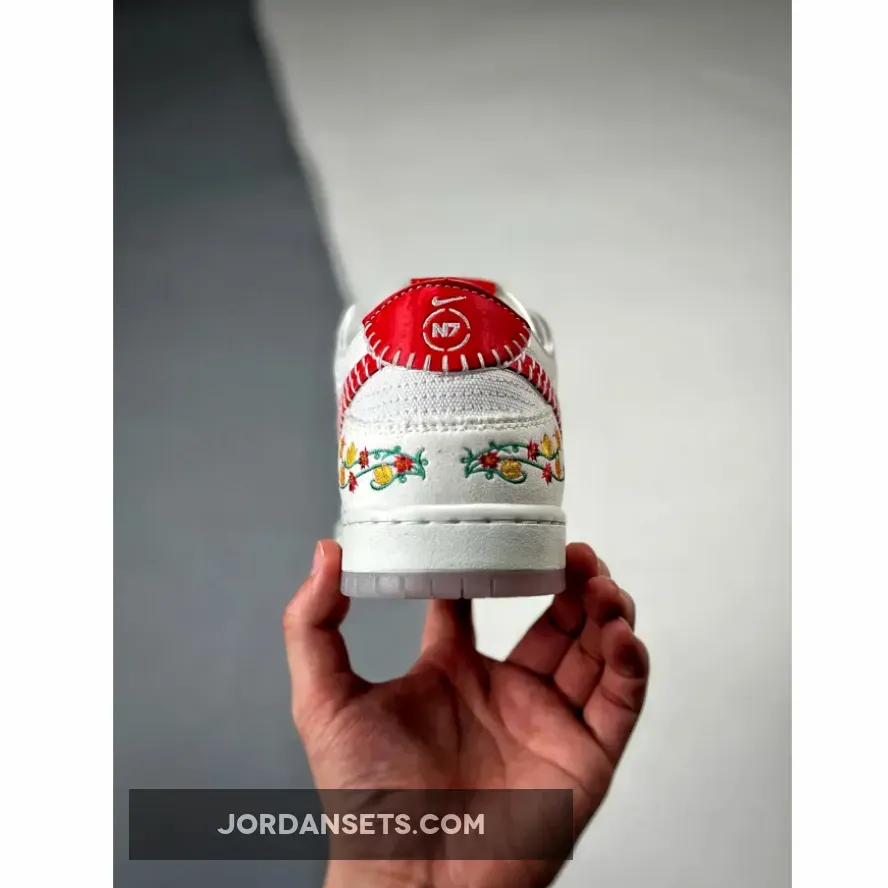 This iteration of the Nike SB Dunk Low Decon N7 is constructed in a mix of materials featuring a canvas base with leather overlays. The difference in this pair is that the sneaker is highlighted by the floral embroidered prints on the Sail overlays (instead of Black) and insoles. This pair also comes with Red accents on the heels, Swooshes and tongue tag. Elsewhere you will find an exposed stitch pattern as well as Red “N7” logos and branding on the tongues, heels, and sockliner. A White midsole and translucent outsole round out the main features of the sneaker.