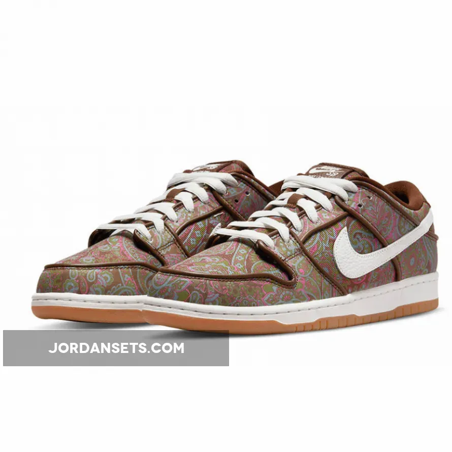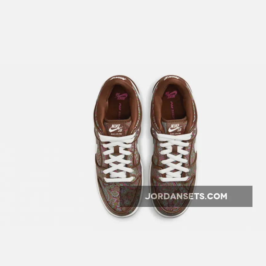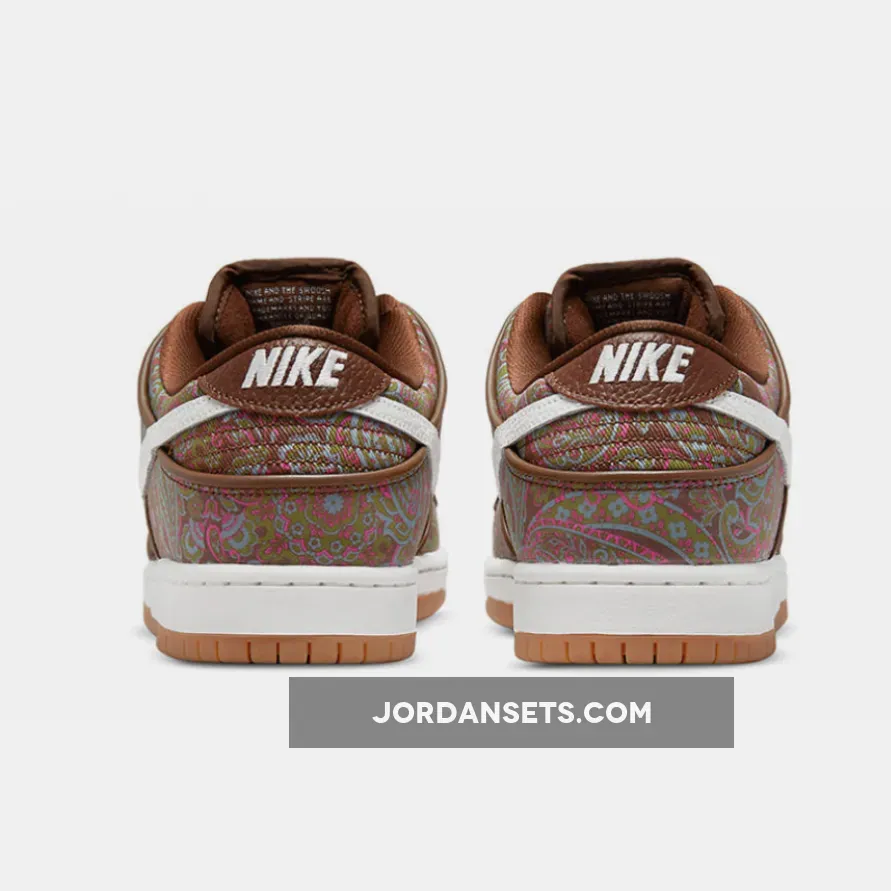 Nike SB Dunk Low Paisley Burgundy is the skateboarding silhouette’s answer to Nike Dunk Low’s “Paisley Pack”. This pair boasts a premium canvas construction that’s decked with a bolder version of the teardrop-shaped pattern. The elegant burgundy base of this SB Dunk Low is designed with chic pink, green and sky blue paisley prints that extend towards the entire tongue and at the heel. Matching the statement-making palette of the upper are matching chocolate-coloured laces and inner lining. In contrast, Swooshes on both the lateral and medial sides sport a colourless hue.