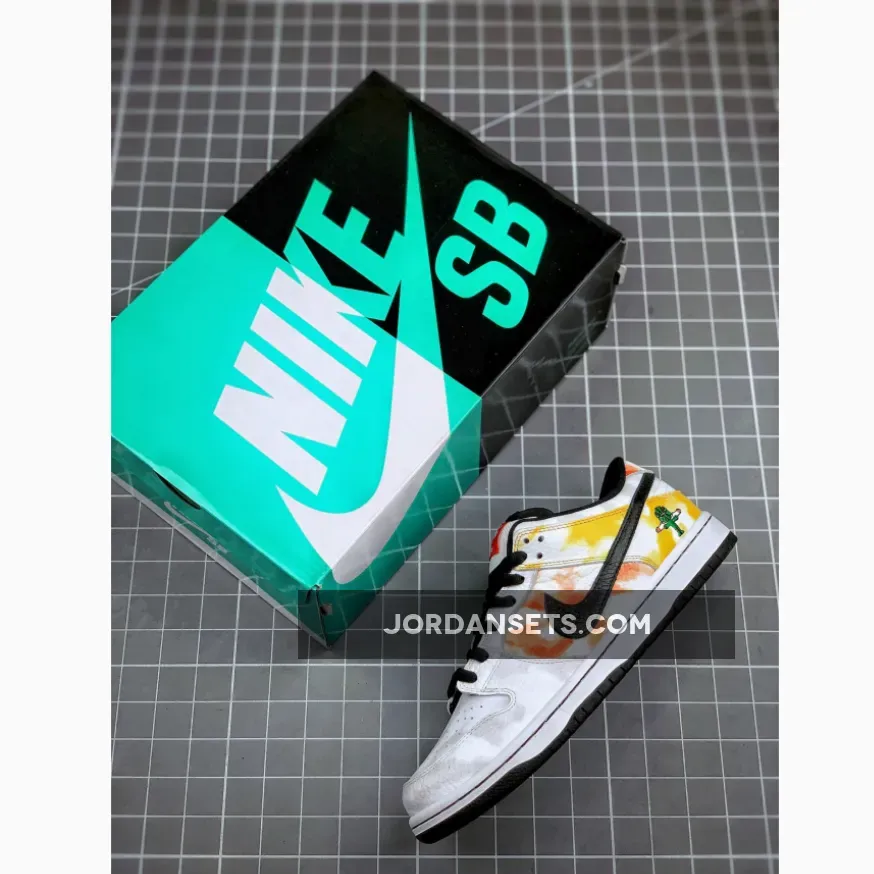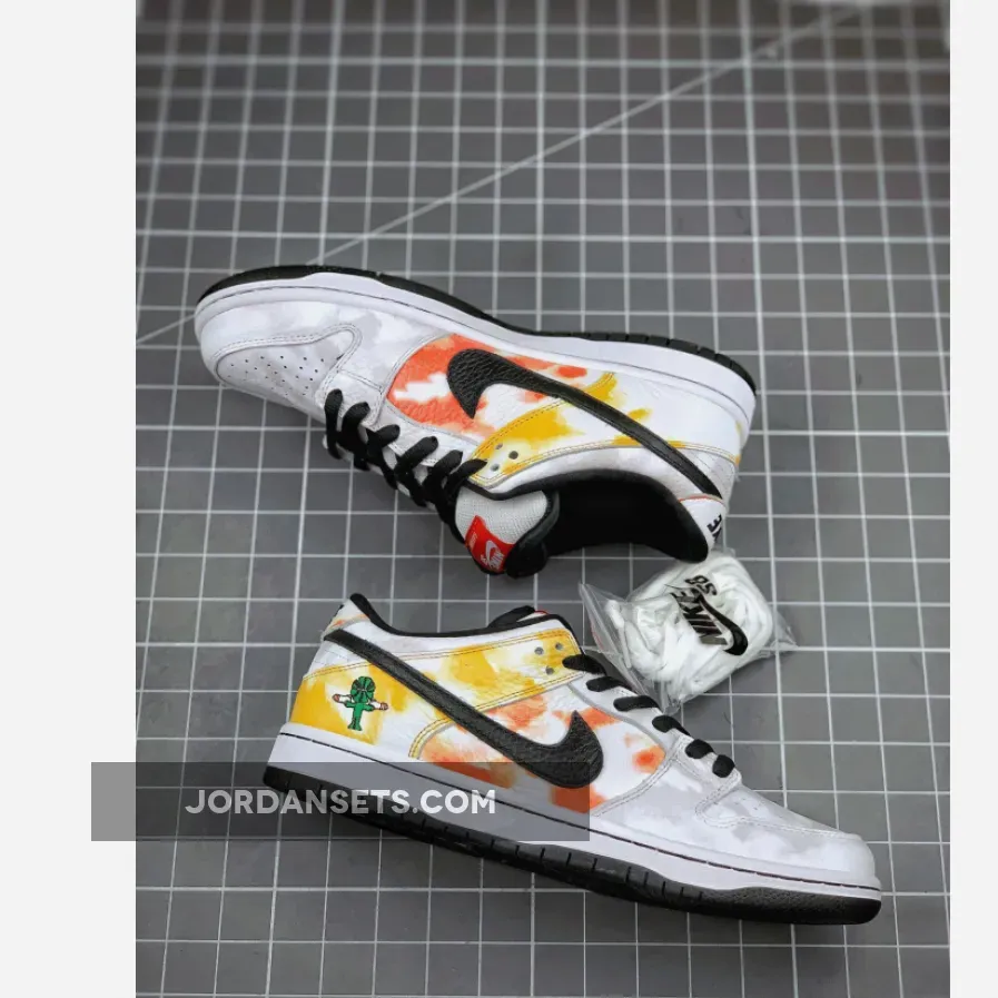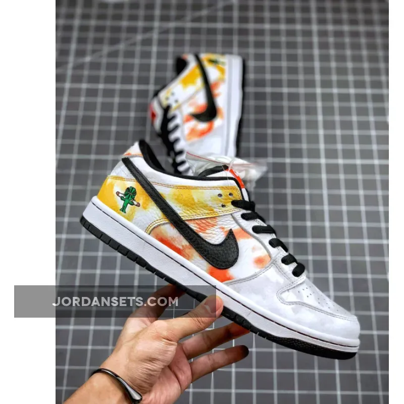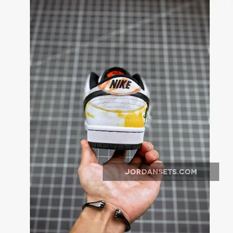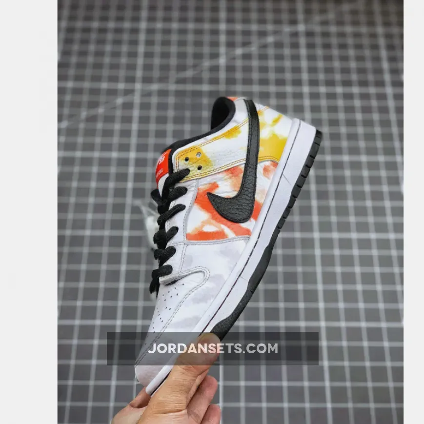 One pair comes in “Home” Black and another in “Away” White. Both Nike SB Dunk Low offerings swaps the original Yellow and Orange rear and mid-panels for tie-dye patterns. Branded tongues, tie-dye insoles completed with the signature “Raygun” logo embroidered on the heels. completes the design.