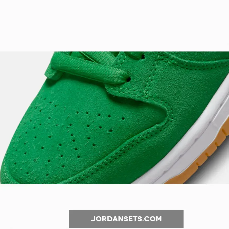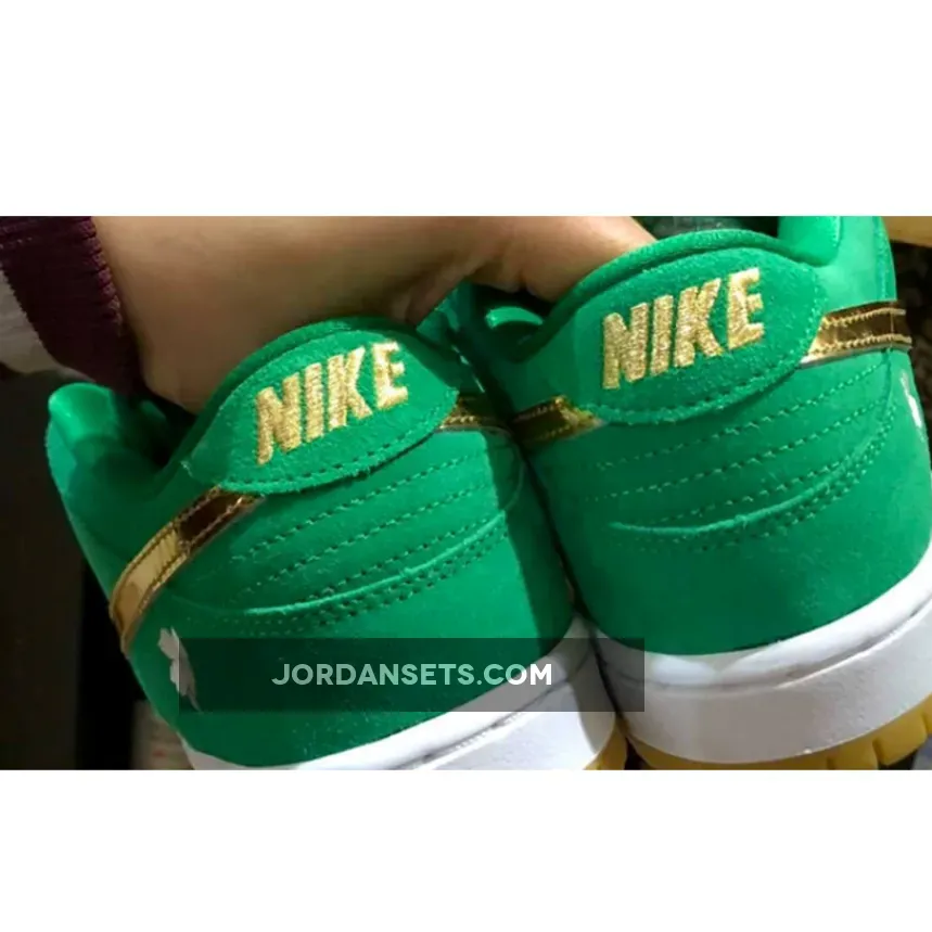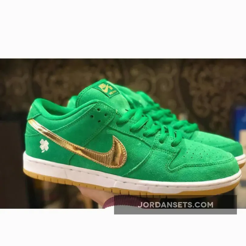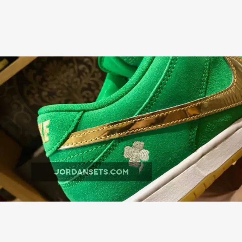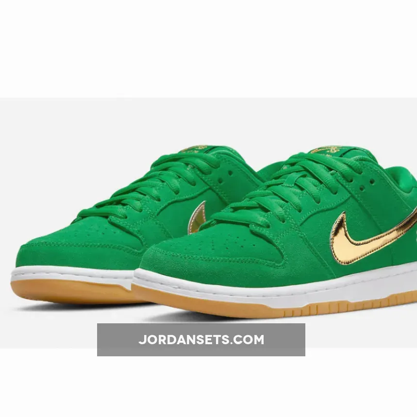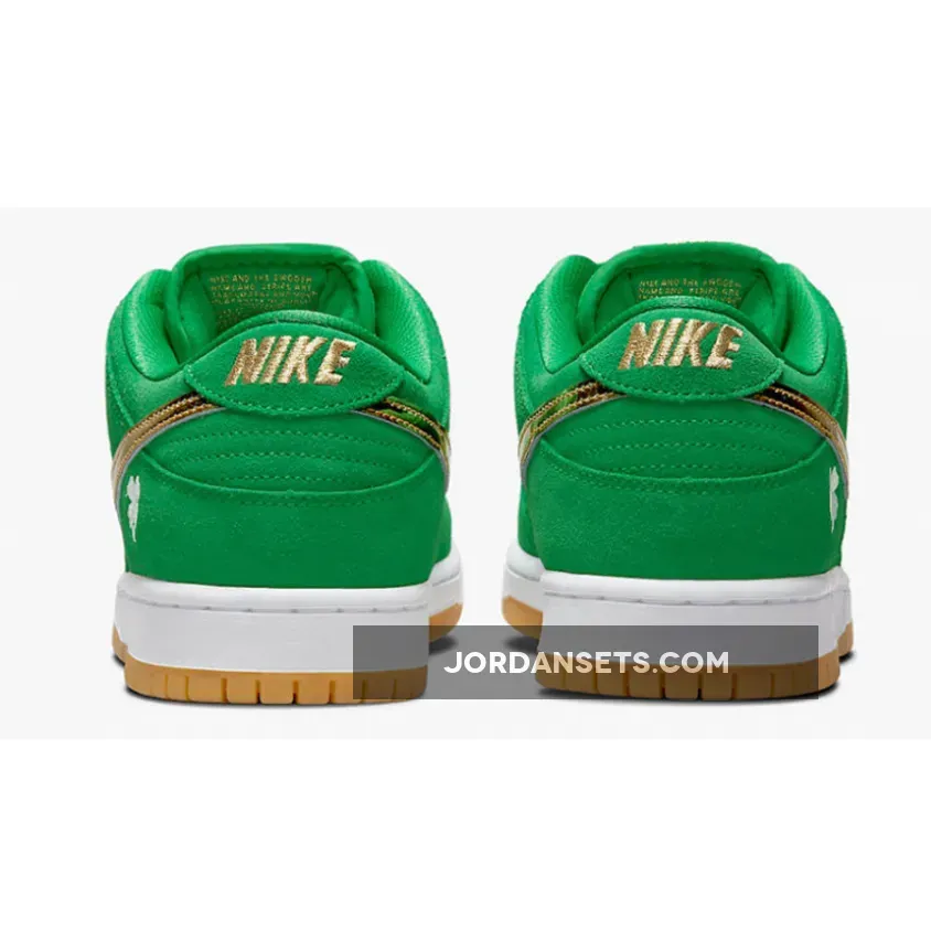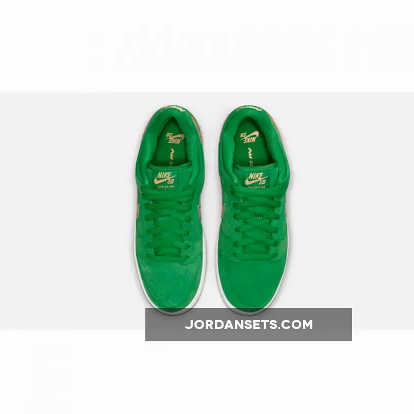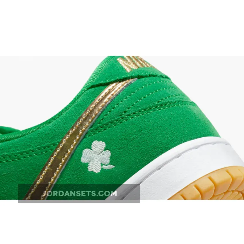 The Nike SB Dunk Low dons some green and a bit of glitter for St. Patrick’s Day. Meet the Nike SB Dunk Low St. The upper of the shoe is made entirely of smooth suede in shamrock-inspired vivid green, matching the laces and the mesh sock liner. The signature profile Swooshes are in eye-catching metallic gold across the medial and lateral quarters. Nike SB branding in gold stands out on the green tongue tab while the Nike text logo is embroidered in gold on the green suede heel tab. A four-leaf clover is embroidered in white on the lateral heel.Shop the Nike SB Dunk Low St.