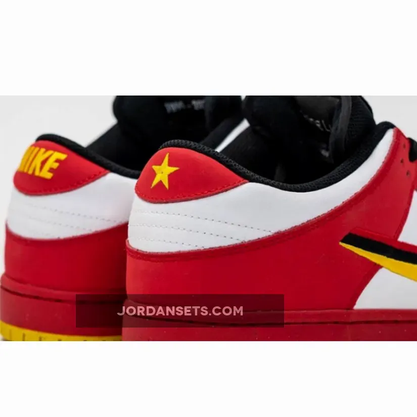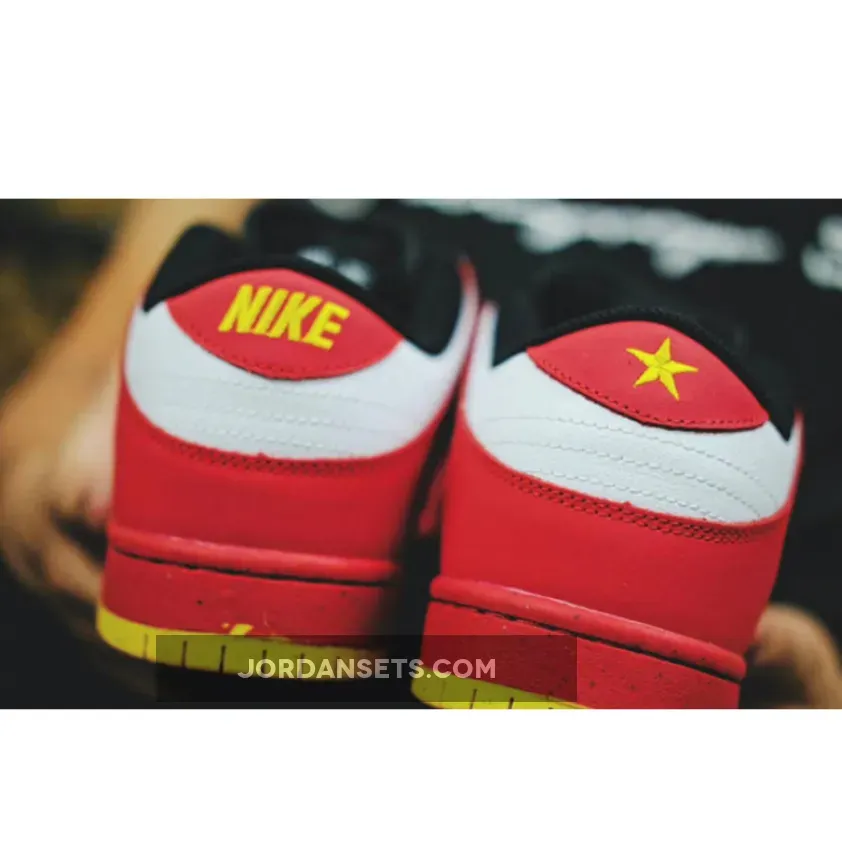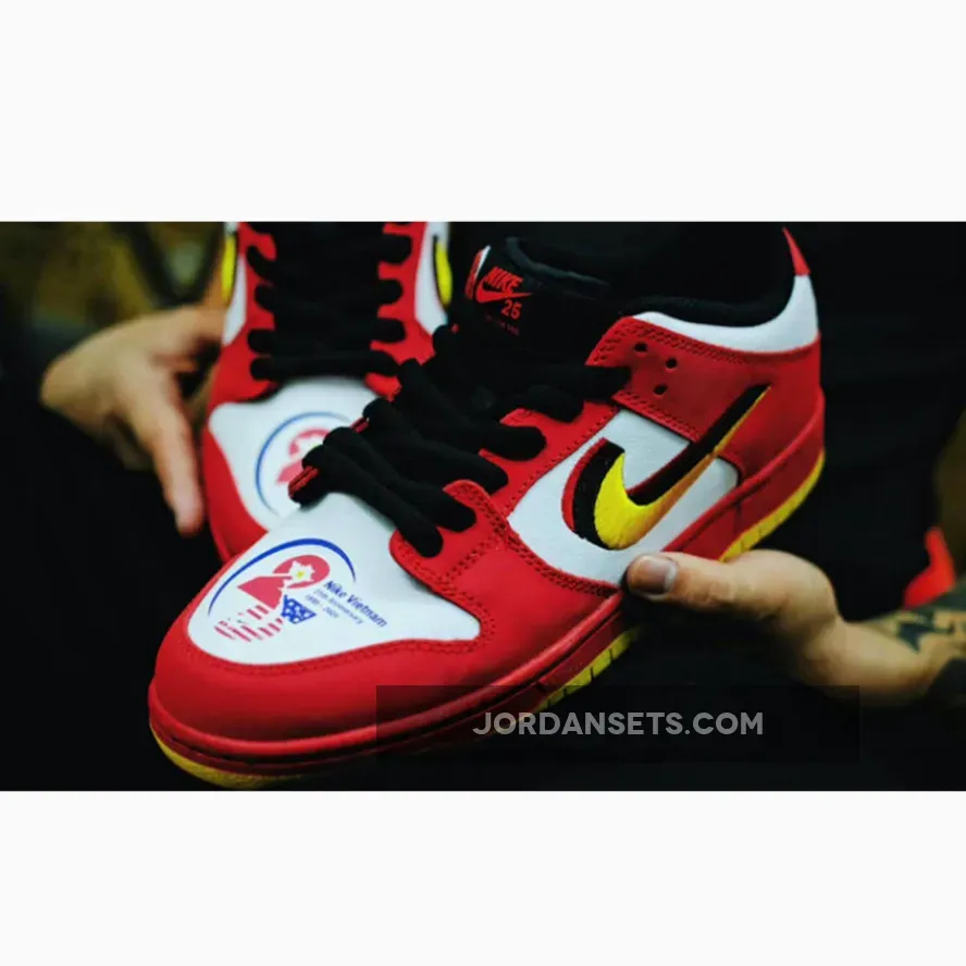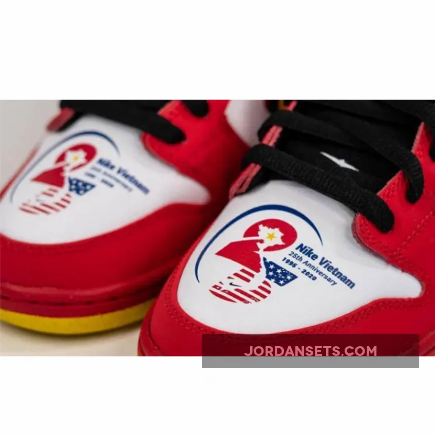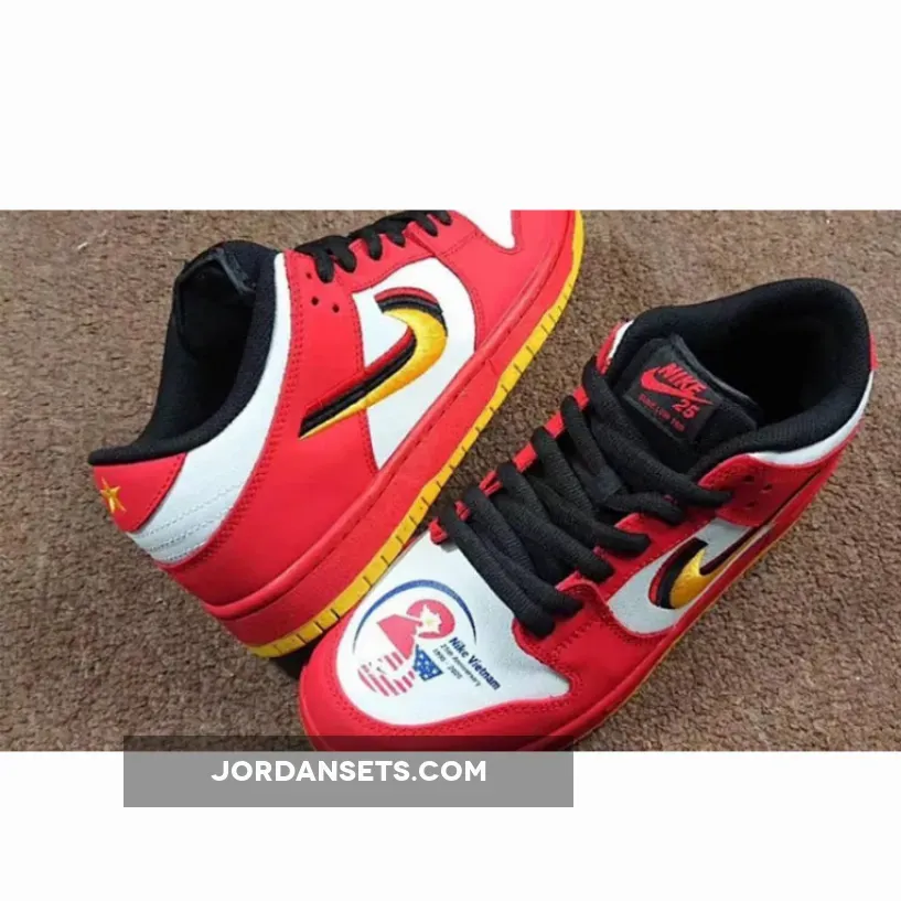 This offering of the Nike SB Dunk Low comes dressed in the Vietnam flag colors. It features a White base with Red overlays, embroidered triple-stacked Swooshes, a tongue label that swaps out the “SB” for the “25”, and a toe box graphic that nods to the commemoration.