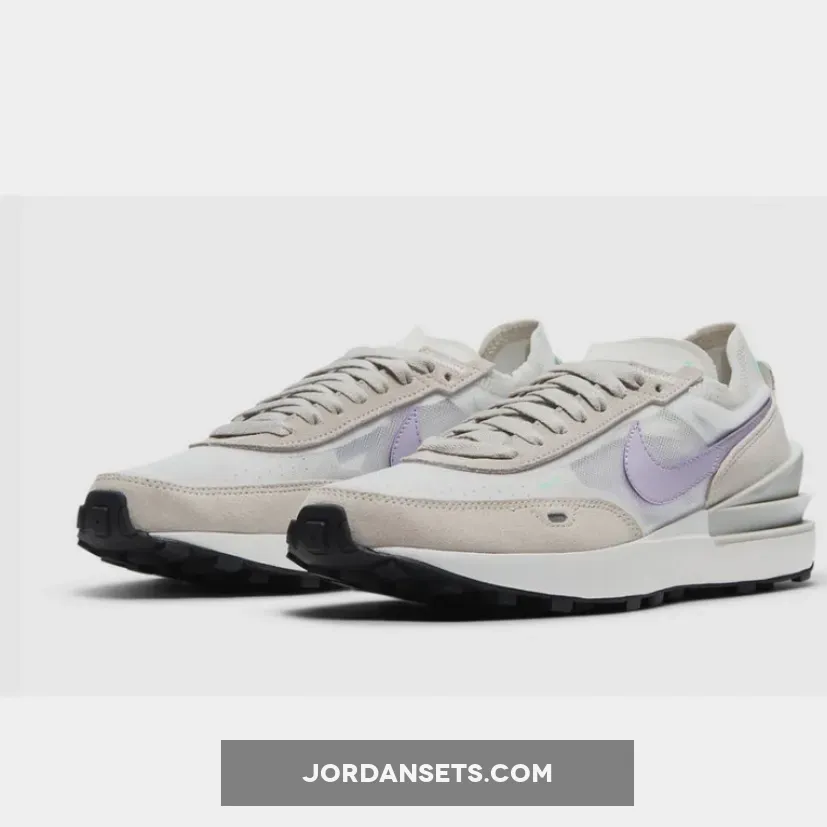 Dressed in a Summit White, Infinite Lilac, and Light Bone color scheme. This offering of the Nike Waffle One features a White mesh upper with Grey suede overlays, Light Purple leather Swoosh logos on the sides, highlighted with hints of Green accents.