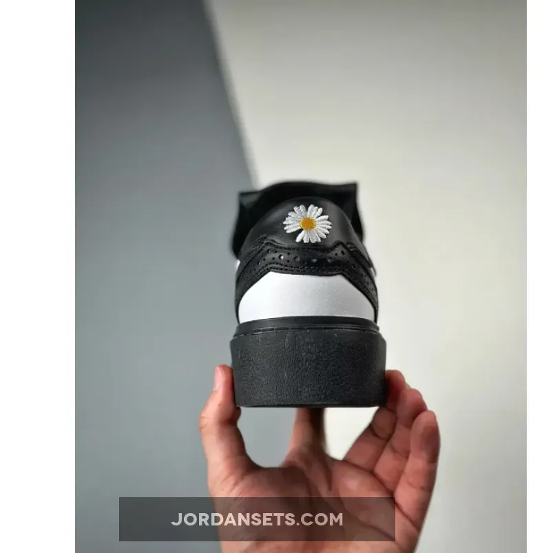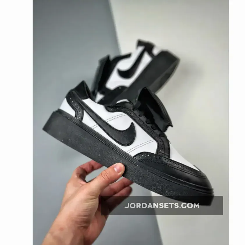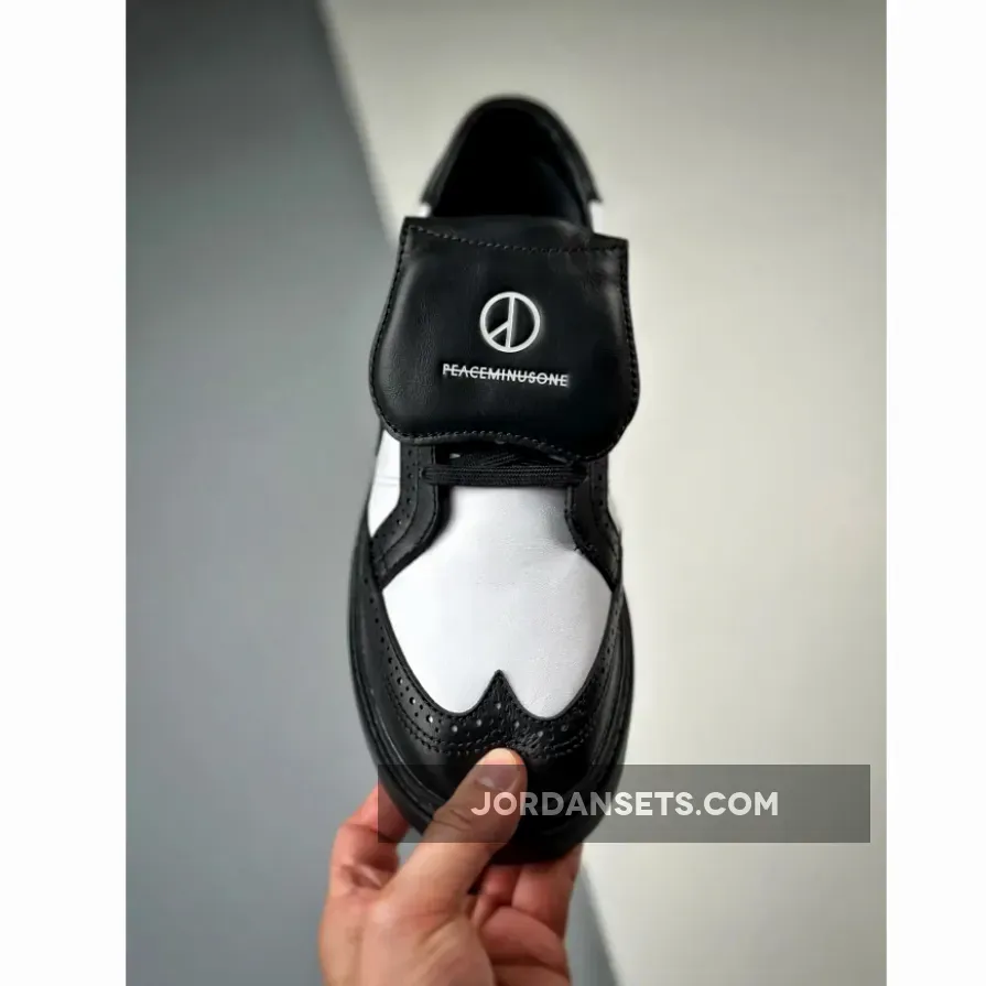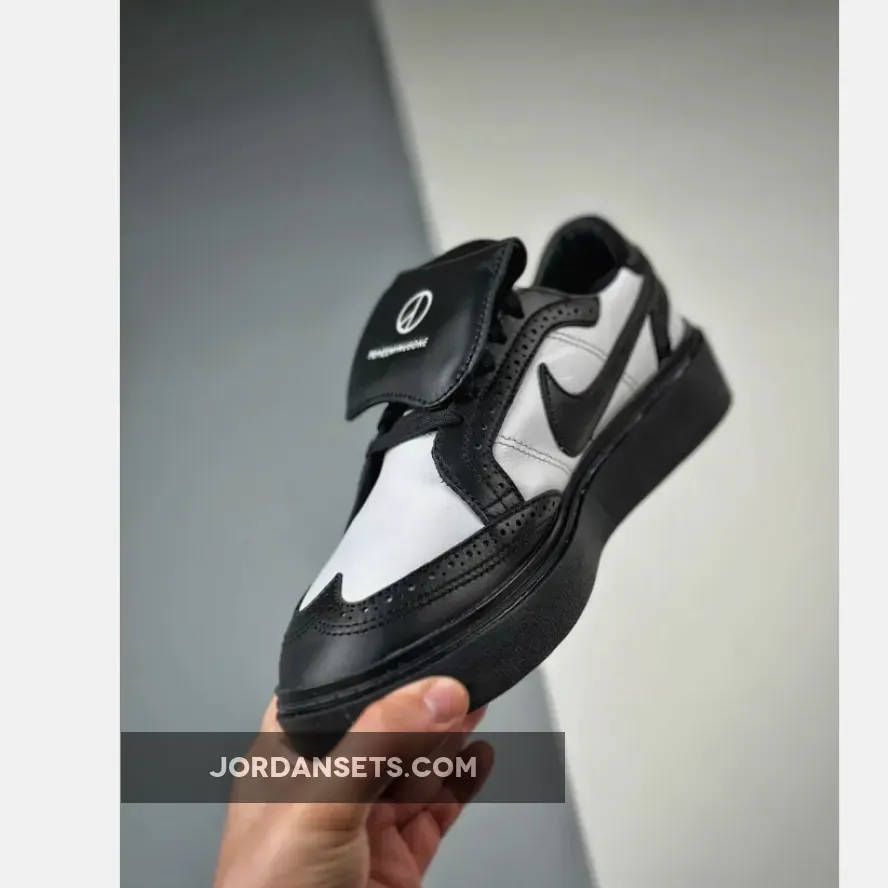 The base is dialed to a crisp white while the leather overlays, Swooshes, thick lace shrouds, bottoms and wing tip toe boxes contrast with a solid black hue.