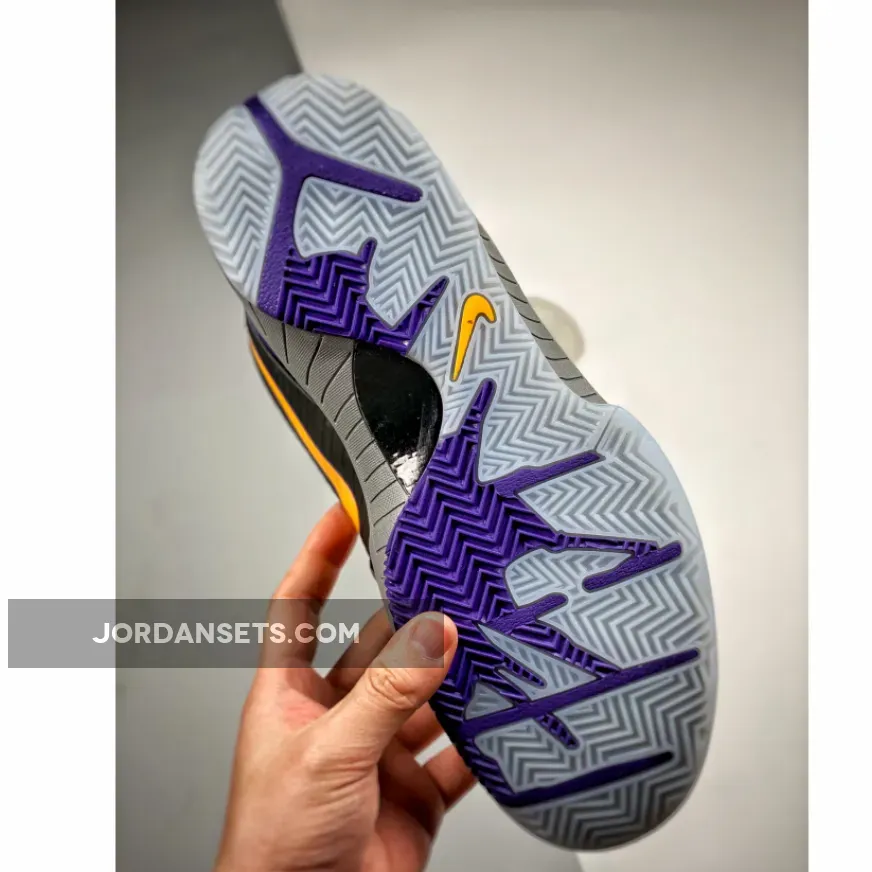 It’s the fourth model of the Kobe Proto series, and we all know it’s going to be the game-changer. The higher quality materials and high definition structure all cram in this kick. It’s a reset of low-cut designs. The pitch black leather walls are exceptionally well built and well furnished to combat the Summer. You can spot the reptile skin leather on the toe box and on the synthetic heel overlay. This feature adds a certain sass to the theme. The colours take the cue from the Los Angeles Lakers’ jersey. Yellow Nike Swoosh logo, inner lining, piping, and laces, and the stitch pattern on the textile collar while purple heel counters with Kobe’s logo on them, a yellow inner liner, and Carpe DIem logos on the tongue. Down below we have a grey midsole and a white/purple rubber outsole to cap off the design.