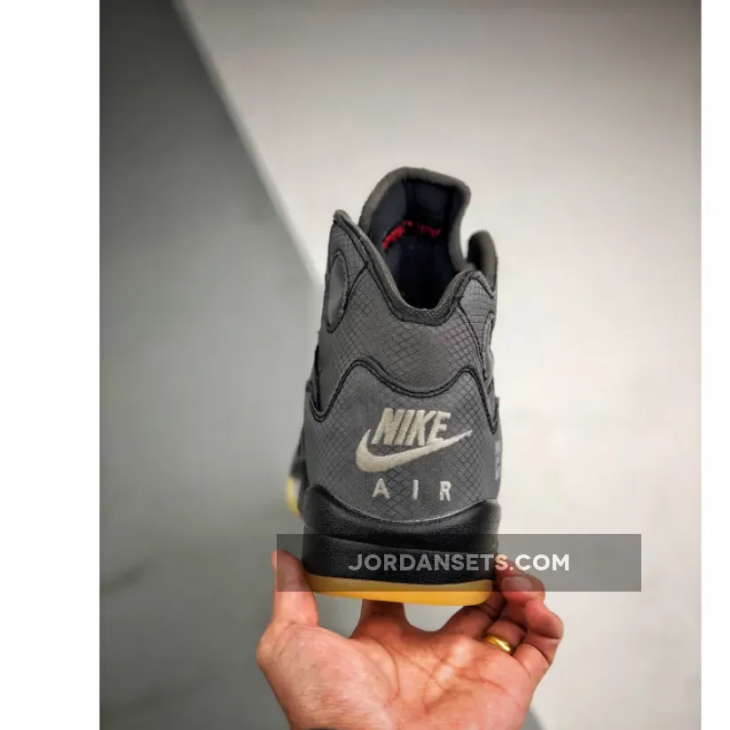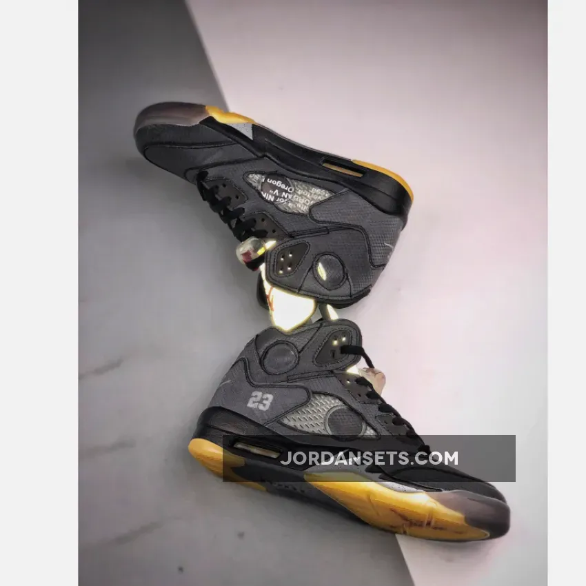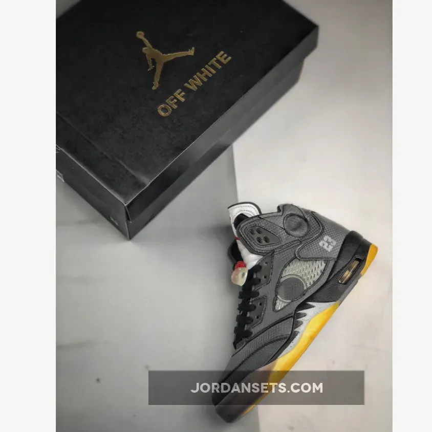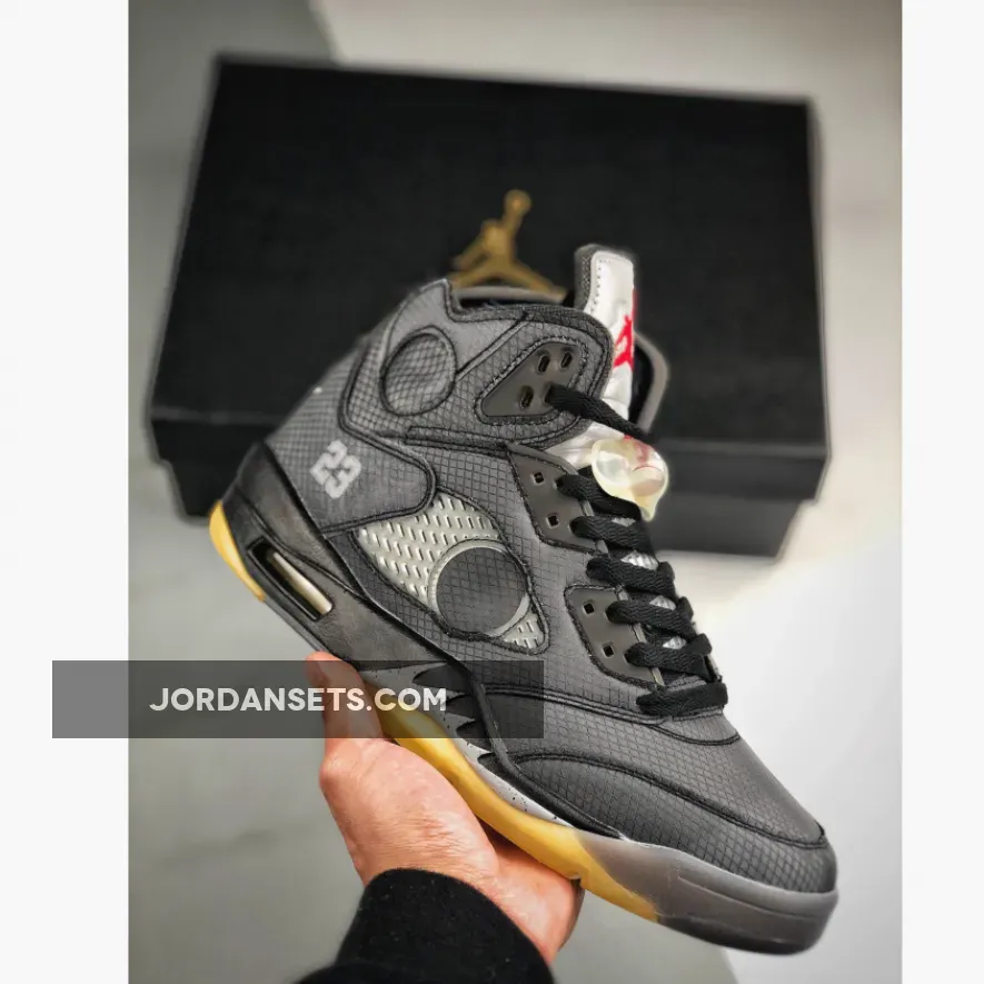 Inspired by the OG “Metallic” Air Jordan 5, this release features a Black textile mesh upper with Off-White’s signature “Shoelaces” branding on the laces along with its text on the inner netting side panel. 3M reflective tongues with a Fire Red Jumpman logo and “23” stitched on the heels atop an aged translucent outsole completes the design.
