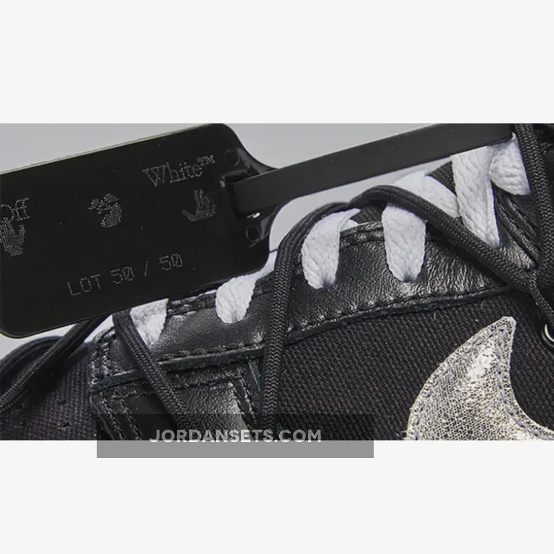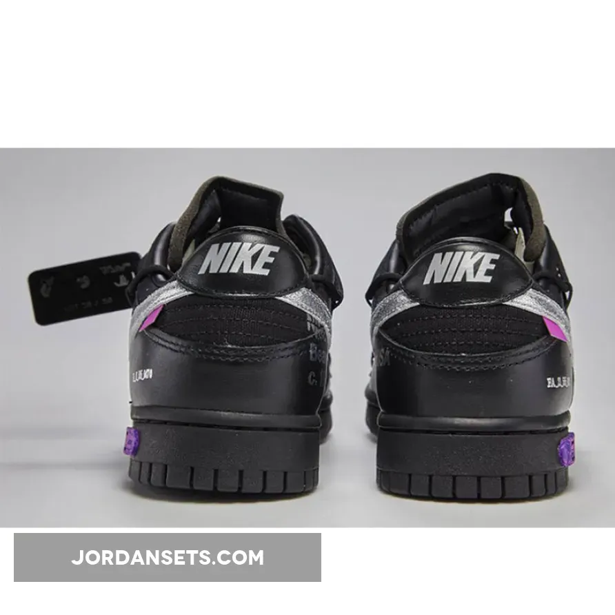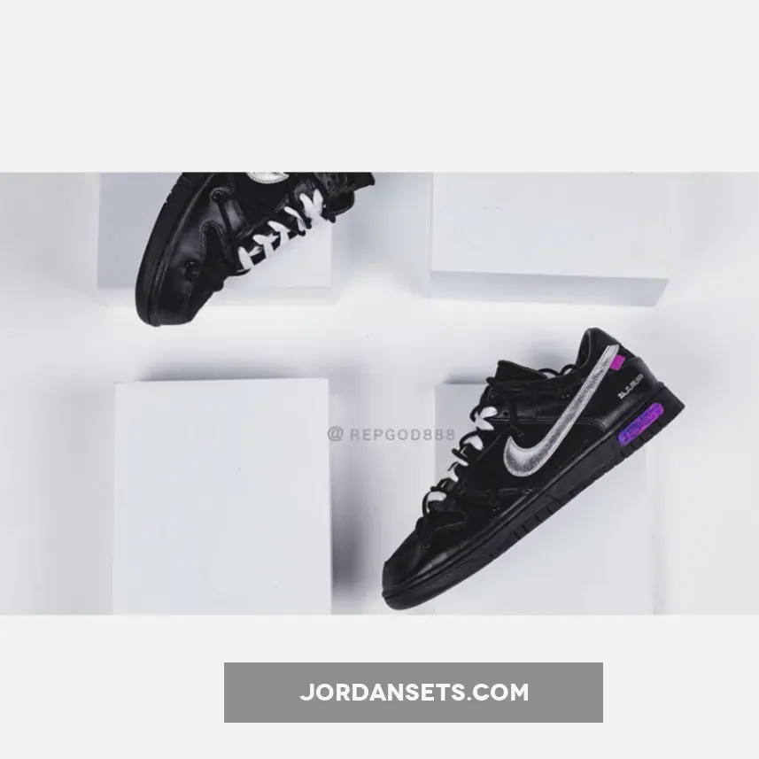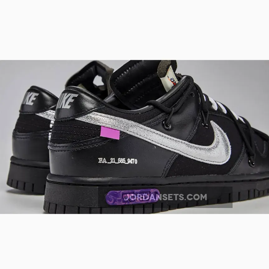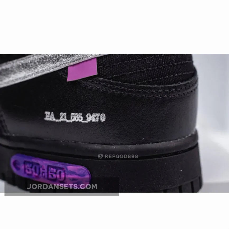 American fashion designer Virgil Abloh has become an icon in the footwear industry since joining forces with Beaverton sportswear powerhouse Nike in 2017 to give ten of their timeless silhouettes a makeover. The Off-White x Nike lineage has undeniably grown throughout the years, but it’s only going to become bigger now that the Off-White x Nike Dunk Low Black Lot 50 is here as part of the duo’s “Dear Summer” offering that includes 50 different Nike Dunk Lows. Official images of the pair are now live, so read on if these are on your must-cop list.If you’ve already seen all 50 pairs from the duo’s Nike Dunk collection, it’s clear to see that the Lot 50 iteration is the standout, alongside the first variation which sees a blanched-out layout. Bearing a blacked-out canvas and leather build, this edition maintains all the Nike Dunk’s notable features, such as the Swoosh logo in silver, but added with Off-White motifs such as the zip tie and overlaces in black, and the midsole’s additional rubber piece towards the rear in purple.
