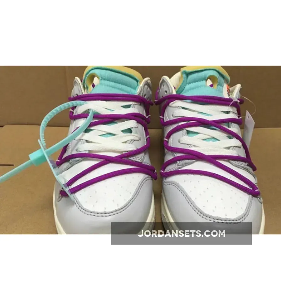 The Off-White x Nike Dunk Low 21 of 50 comes with Purple hiking laces, bright Green tabs on the Swoosh, Teal tongues and zip ties, and a Grey/Yellow number plate reading “21 of 50.”
