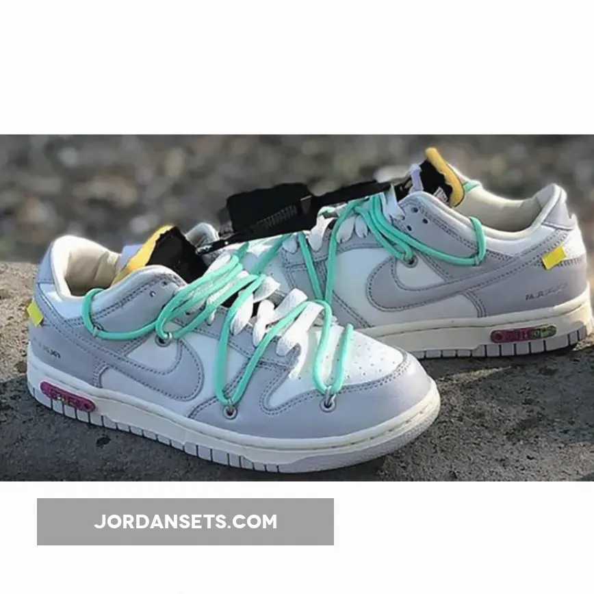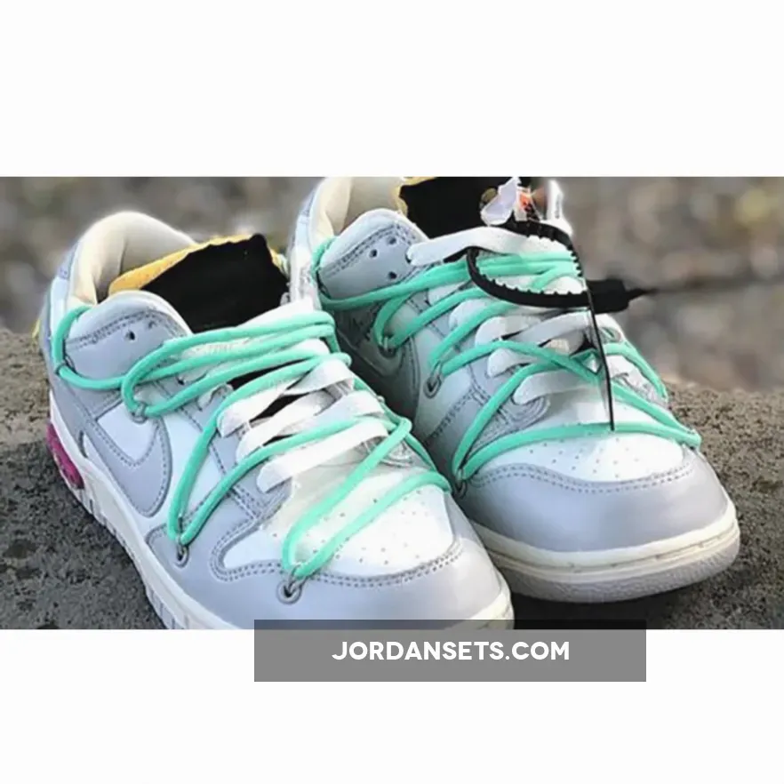 This Off-White x Nike Dunk Low is taken from the ‘Dear Summer’ collection, a sprawling follow-up to Virgil Abloh’s first Nike Dunk collaboration from 2019. The low-top makes use of a white leather upper with soft grey canvas overlays, along with Virgil Abloh’s calling-card flourishes, which include a plastic zip tie and printed Helvetica text. Contrasting pops of color arrive via the sneaker’s secondary lacing system, zip-tie, an exposed-foam tongue and a rectangular tab affixed to the Swoosh. Limited to fifty pairs, a ’5 of 50’ badge is affixed on the lateral midsole.