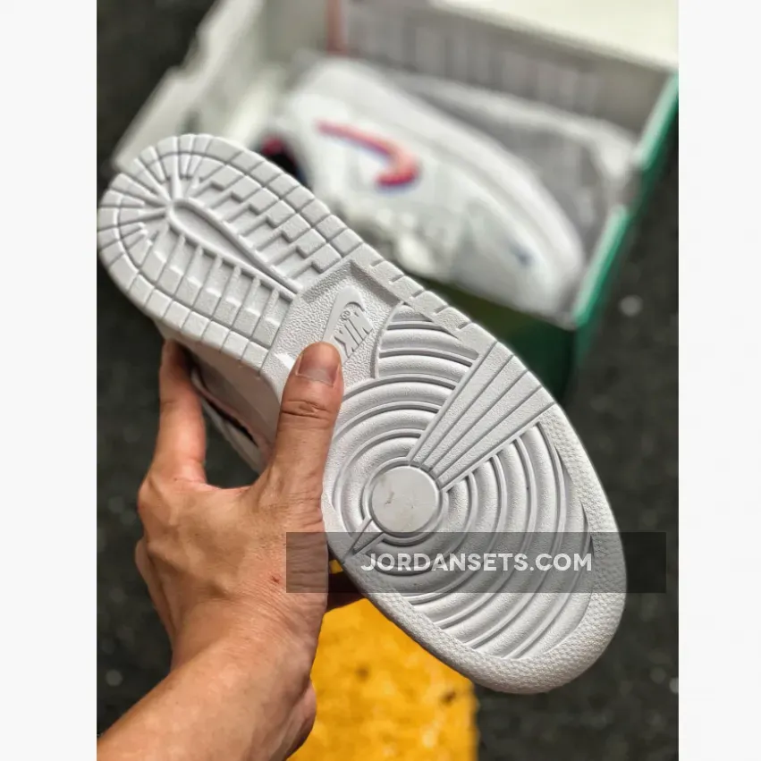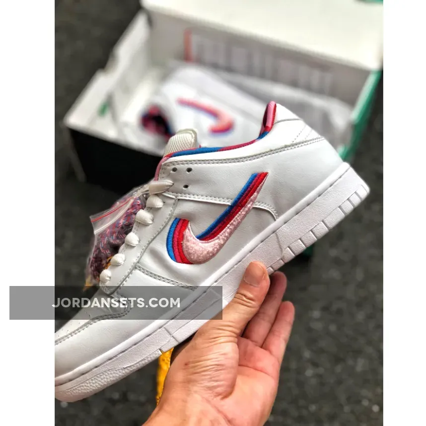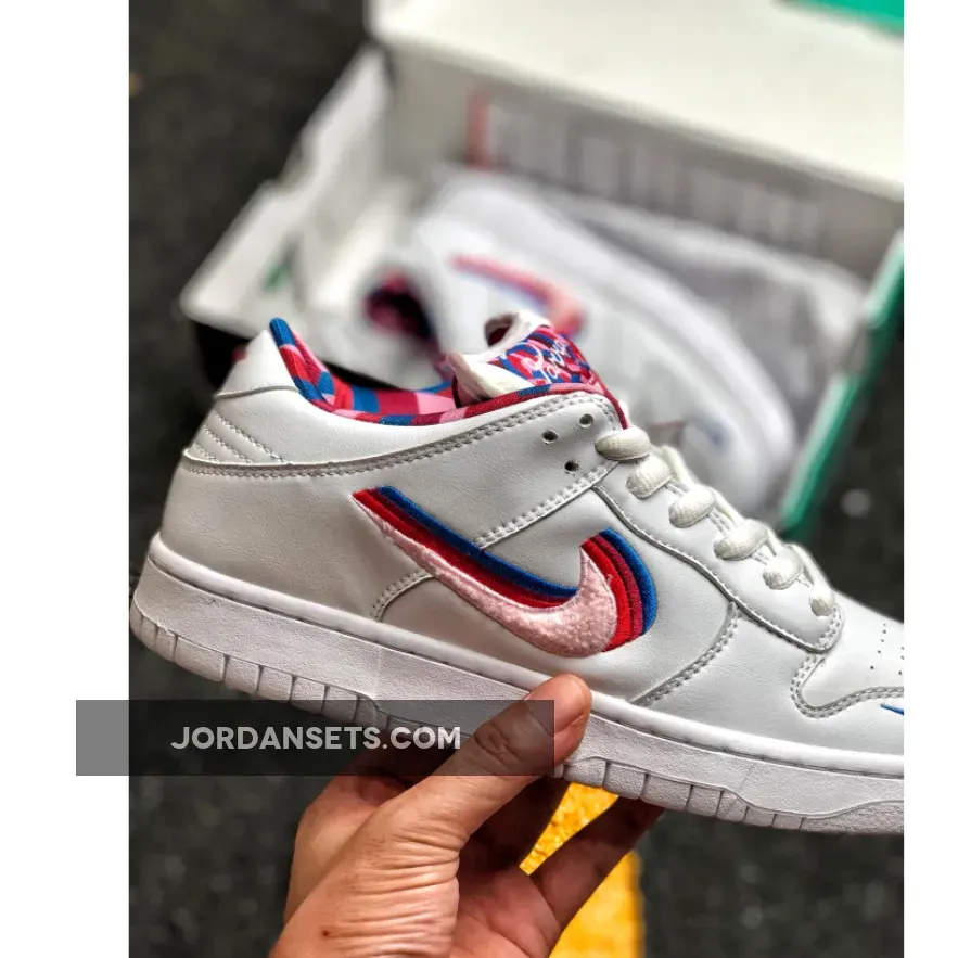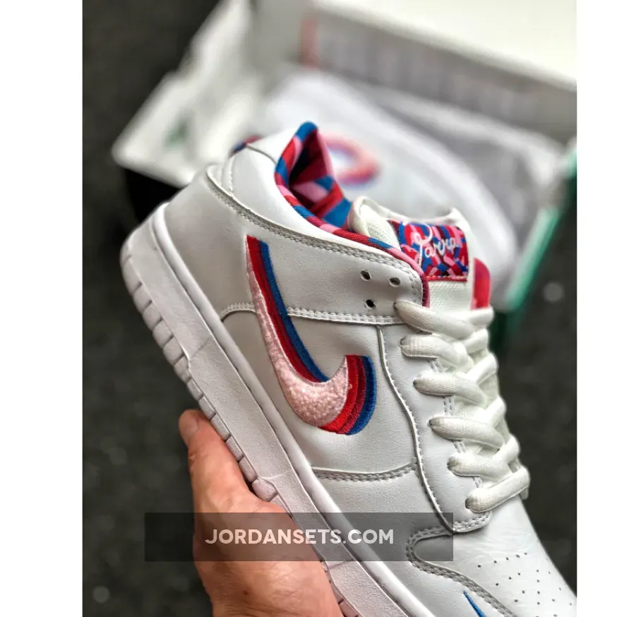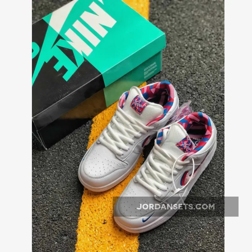 A redesigned version of the OG Nike SB shoe, this sneaker features an all-white upper, midsole, and rubber outsole. On its upper, it spots a minor blue Nike Swoosh near its perforated toebox and hyper-saturated pink, red, and blue Nike Swoosh overlays on its sides, as well as a Parra logo on its heel tab and tongue tag. Just like its side Nike Swoosh overlays, its features a hyper-saturated pink, red, blue interior.