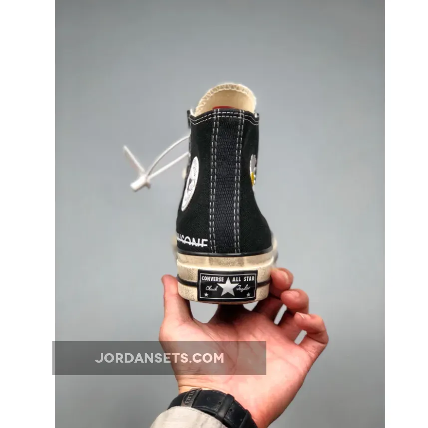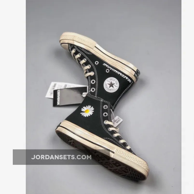 This Converse Chuck Taylor comes with Black on the base while PEACEMINUSONE’s signature sunflower is embroidered on the heel. In addition we have PEACEMINUSONE text with a strike through it by the midsole, close to the heel and right above it is the standard Converse patch logo.