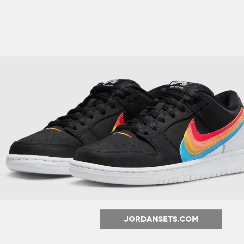 Show off your creative side with the Polaroid x Nike SB Dunk Low Pro Black. If Polaroid’s famous analogue instant film camera is reimagined as a shoe, this is what it would look like. The pair starts with a smooth all-black suede and nubuck construction which allows the layered rainbow Nike Swooshes to shine even more. This multicoloured take on the brand’s famous Check is a nod to Polaroid’s famous eye-catching logo. The bright palette extends to the insoles; the left has a warm orange-red hue while the other has a cool colour combination featuring green and blue. It’s also seen at the vamp where a thin colourful embroidery strip can be spotted. Flaunt this picture-perfect pair and say, Nike.