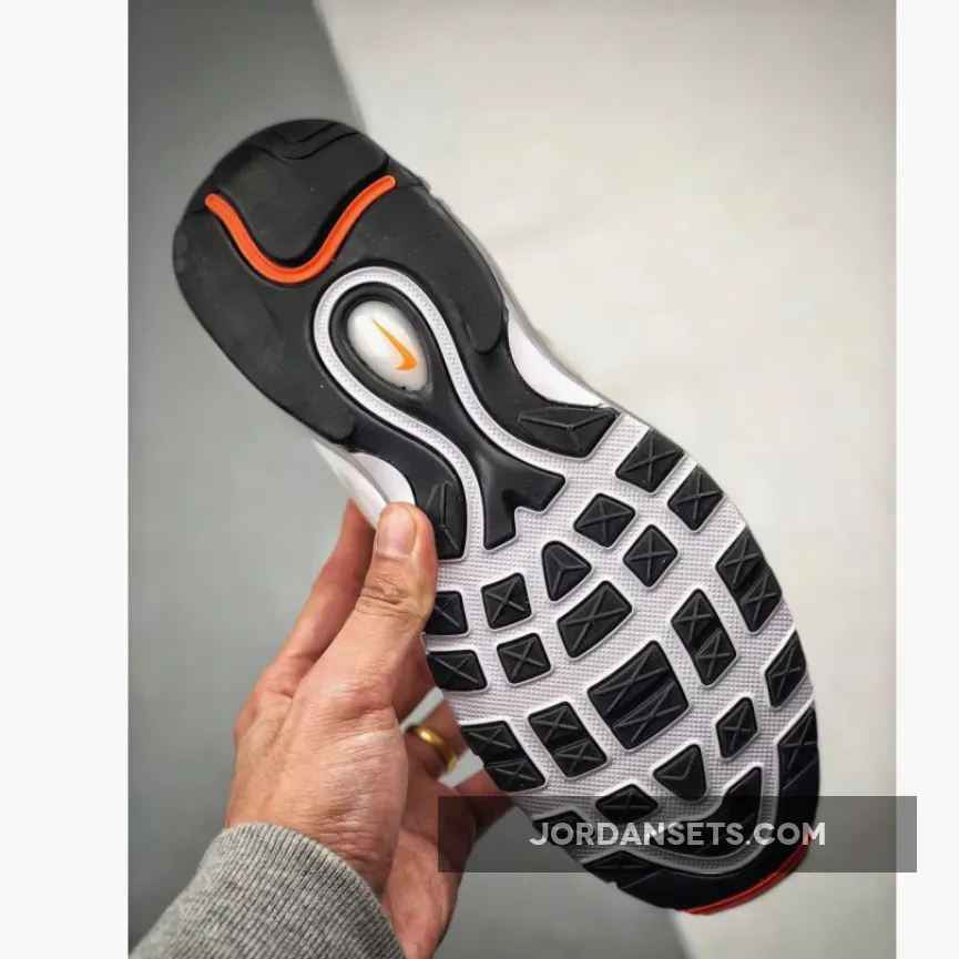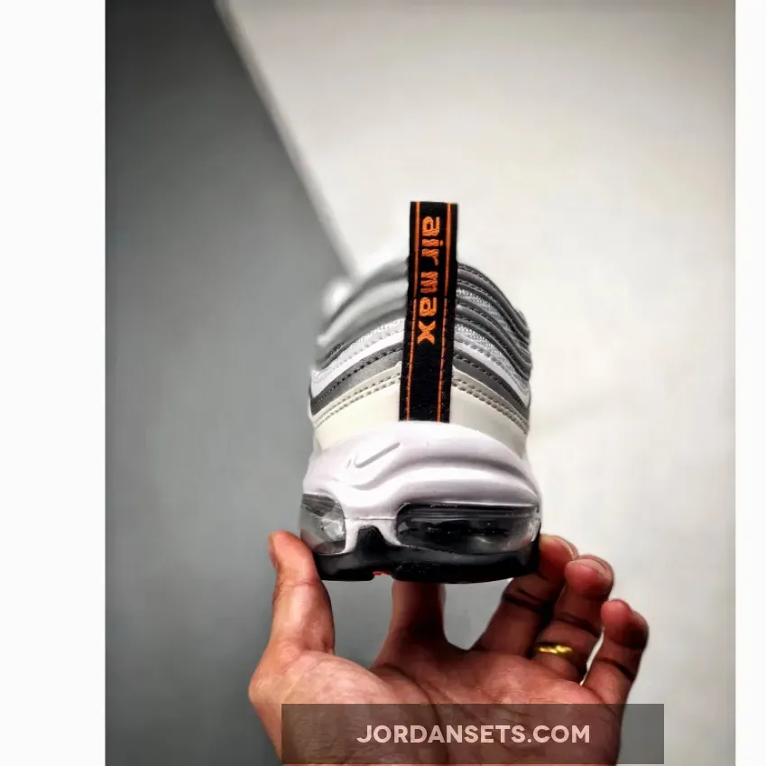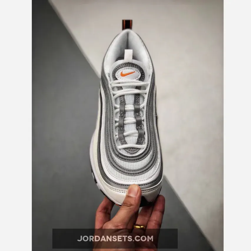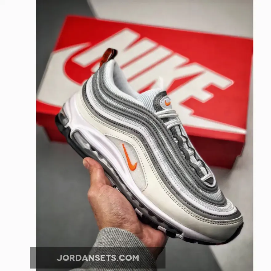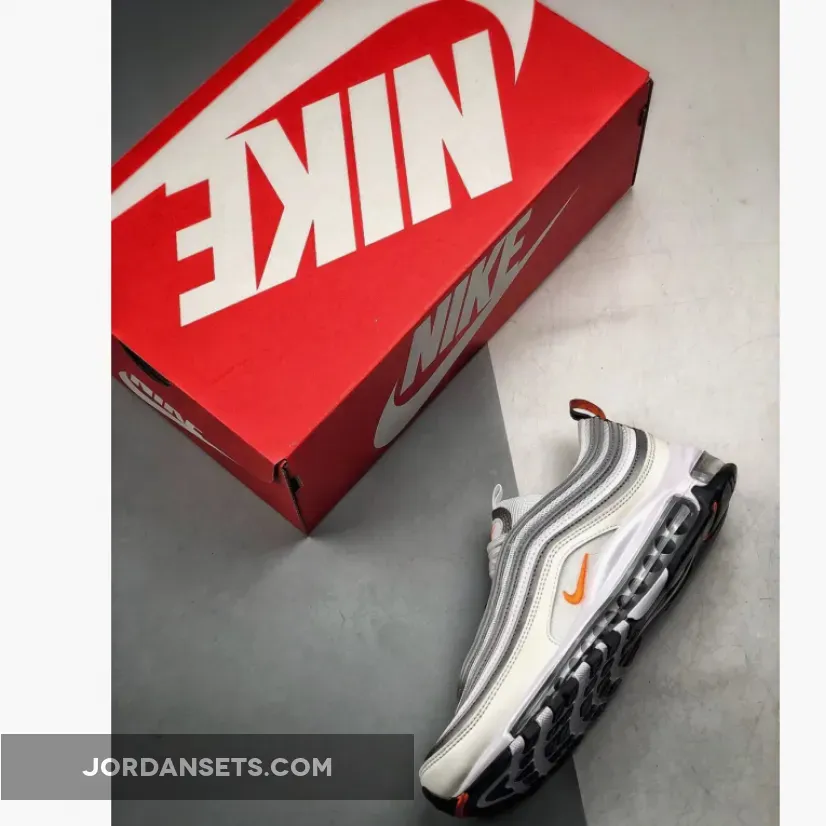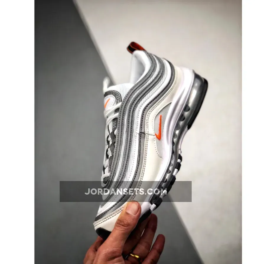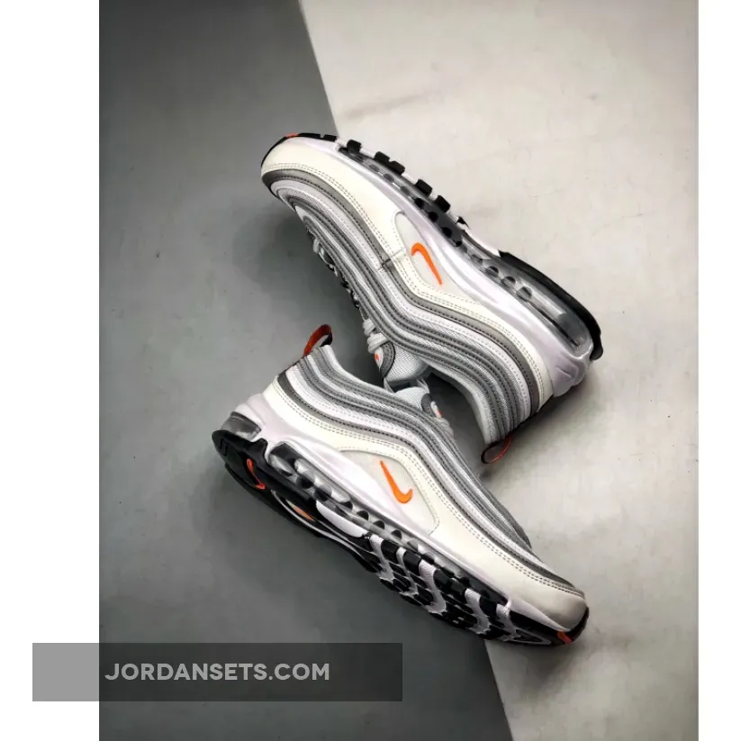 Dressed in a White, Cone, and Metallic Silver color scheme. This Nike Air Max 97 features an all-White upper paired with Orange Nike Swoosh logos throughout. A Black/Orange heel tab atop a Black rubber outsole completes the design.
