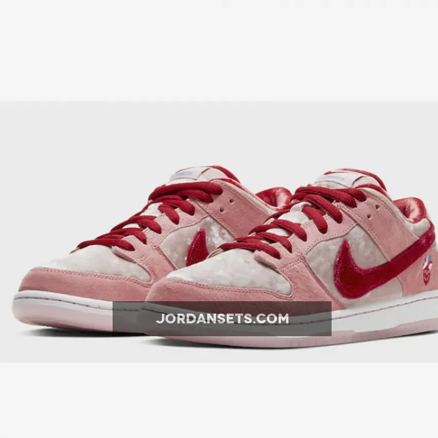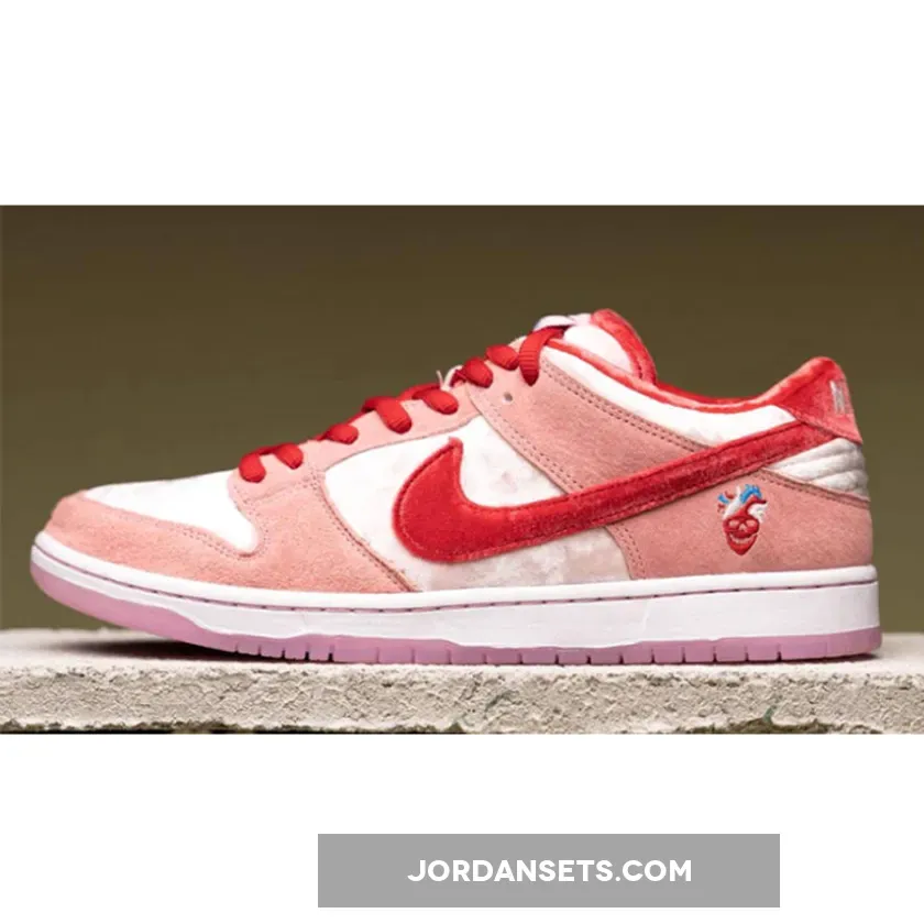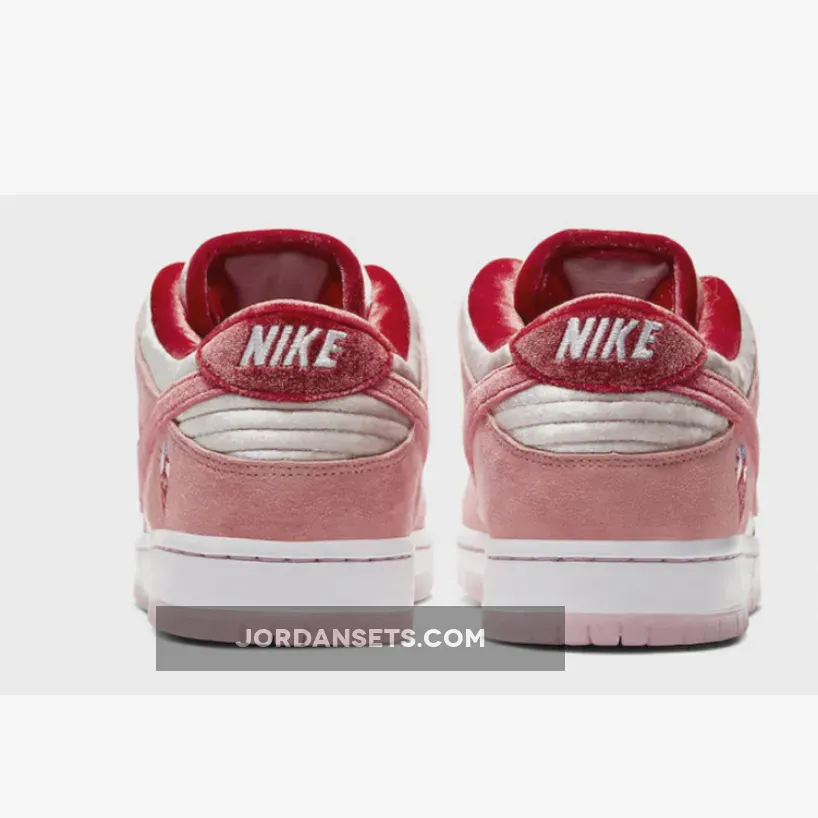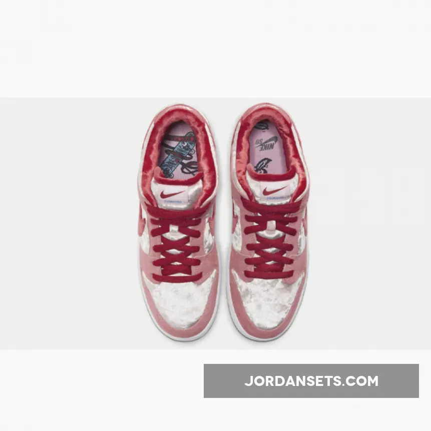 Made in collaboration with Sean Cliver’s skate brand, the StrangeLove x Dunk Low SB QS ‘Valentine’s Day’ celebrates the romantic holiday with a plush take on the retro silhouette. The upper is constructed from white crushed velvet with pink suede overlays and a red velvet Swoosh.
