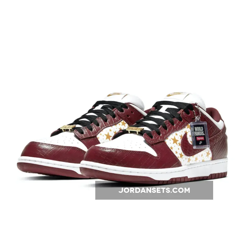 Arriving as one of the hottest colorways from the Swoosh brand and Supreme’s upcoming collab, the hotly anticipated Supreme x Nike SB Dunk Low Stars Barkroot Brown is a brand new pair of Nike Dunks that deserves a spot in your sneaker collection. Official images of the kicks have arrived here at Our Store Supplier so stay on this page for a closer look, and make the most use of our Supreme x Nike SB Dunk Low Stars Barkroot Brown raffles list for your best chance at securing your pair.Arriving in a low cut silhouette, a crisp white leather upper is furnished with panels tinted in tawny brown croc skin overlays for an eccentric look. A series of metallic gold stars on the side panels proudly nods to the legendary Nike Dunk High collaboration initially introduced by the Swoosh brand and New York City-based skate store Supreme back in 2003.Additional co-branding details are present on the tongue, heel tab and insoles to further cement the coveted collaboration. Tagged with a retail price of 85 a pop, these will no doubt be met with hype from sneakerheads and skaters, so if you’re looking to get your hands on these, make sure you’re clued up by staying locked into our social media channels at all times.