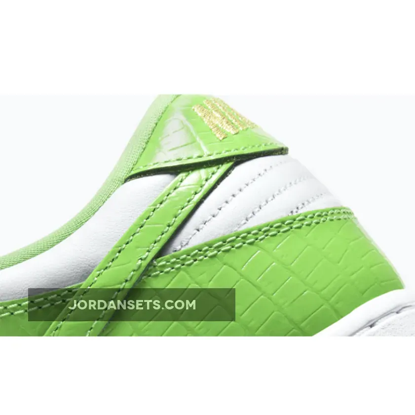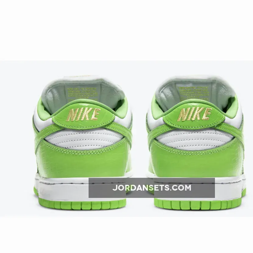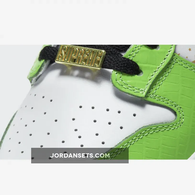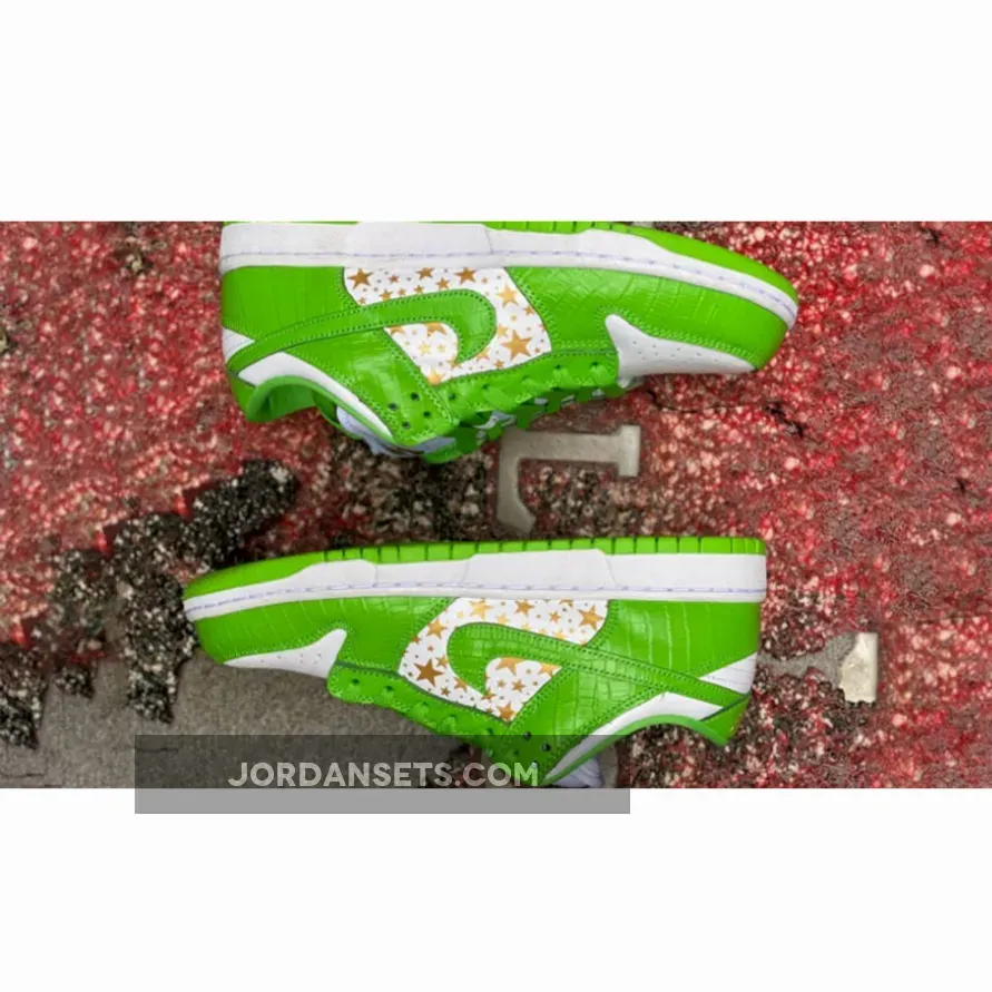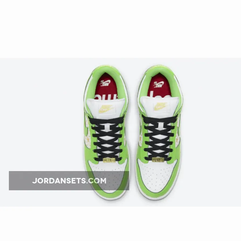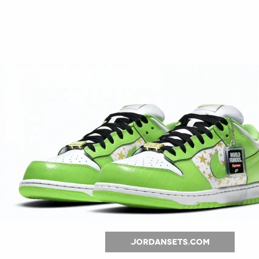 It has been a while since we saw the Swoosh team and New York City-based skate shop Supreme get together to release a pair of Nike Dunks, but the good news is that the Supreme x Nike SB Dunk Low Stars Mean Green is arriving very soon. If you are an avid Supreme collector or simply looking for a new pair of kicks to skate in while still looking stylish on your board, the Supreme x Nike SB Dunk Low Stars Mean Green raffles list is now live for your best chance to cop.Releasing as part of the aforementioned duo’s upcoming SB Dunk Low collaboration this season, official images of the pair boasts a clean combination of white, green, and gold hues throughout. Crafted with a smooth leather upper, a plethora of metallic gold stars we know and love from their initial Dunk High collaboration appears here on the quarter panels. A bold green hue adorns the panels from heel to toe constructed with faux crocodile leather textiles for a luxurious rugged look.This shoe will undeniably elevate your sneaker collection so if you are planning to cop the Supreme Nike SB Dunk Low Mean Green, stay up to date with us here at Our Store Supplier for the latest information as they are expected to drop next week on the 4th of March.