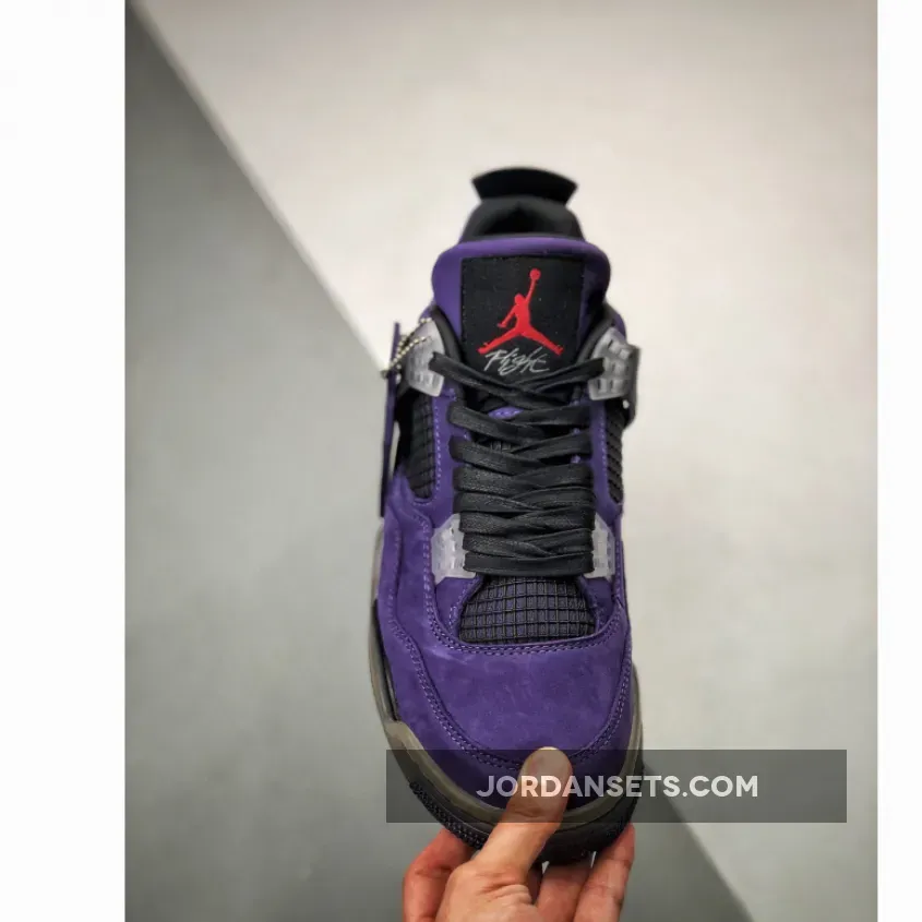 thanks to Bloody Osiris, we get a look a third colorway of the Air Jordan 4 that comes dressed in Purple. This pair features a full Purple nubuck upper with Grey and Black detailing throughout. It even includes the Travis Scott x Air Jordan hangtag, which nods to the collaboration.