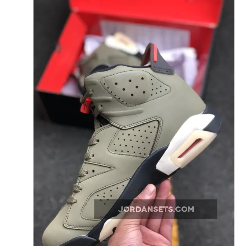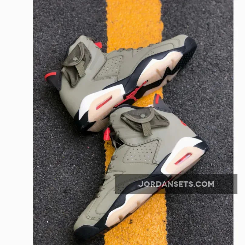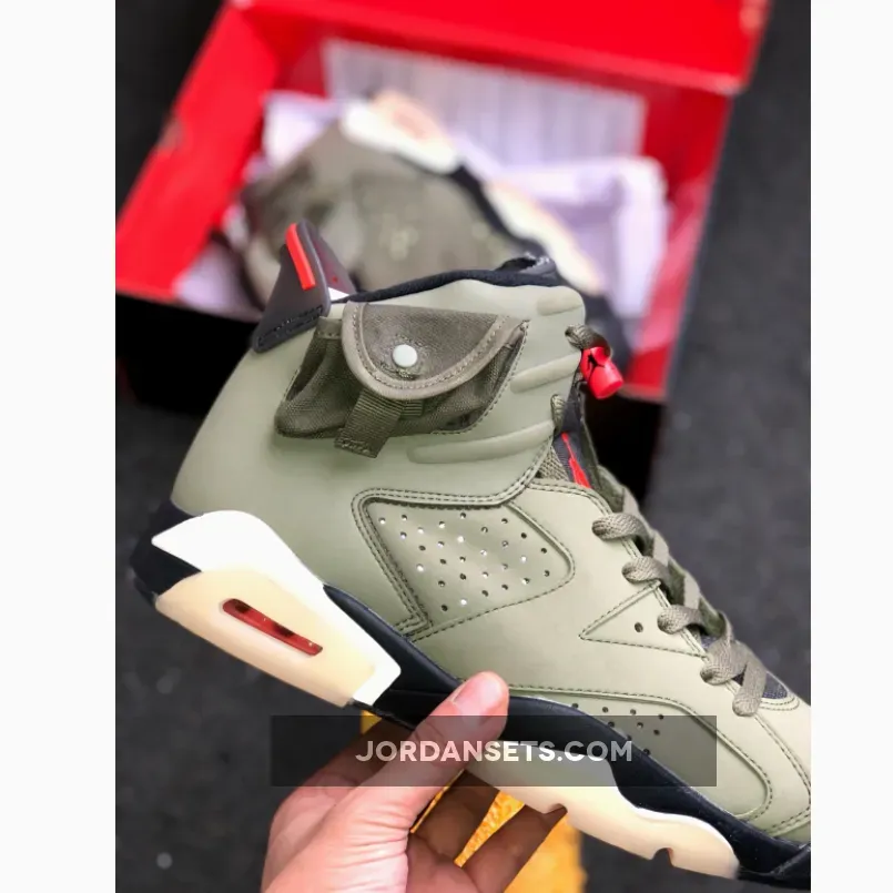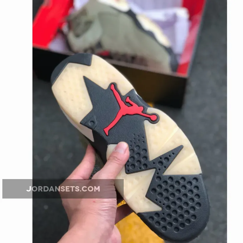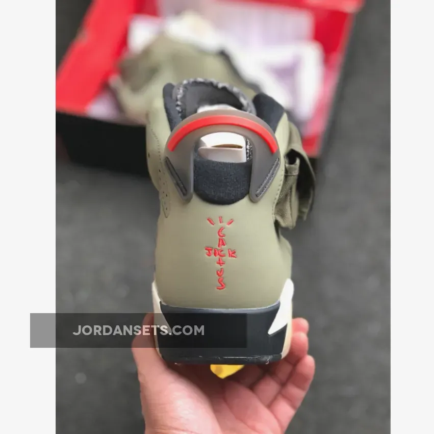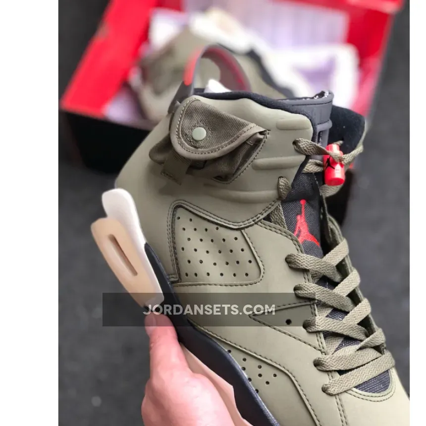 Dressed in a Medium Olive, Black, Sail, and University Red color scheme. This Air Jordan 6 features an Olive-based upper with Black detailing and Red contrasting accents. A side pocket on the collar, Sail midsole, glow-in-the-dark translucent outsole, 3M detailing and both Nike Air and Cactus Jack branding completes the design.