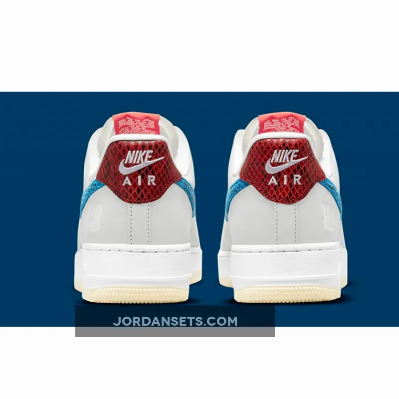 5 materials, 5 strikes, the offering is a vivid arrangement of texture and color. The Swoosh as well as the heel tab don snakeskin throughout, the scales colored in a bright blue and deep red, respectively. Elsewhere, suede overlays opt for a grey finish, while the underlying leathers dress up in a subtle off-white shade. Underfoot, white midsoles are paired with yellowed treads, while bright orange pops along the tongue label and the co-branded insole.