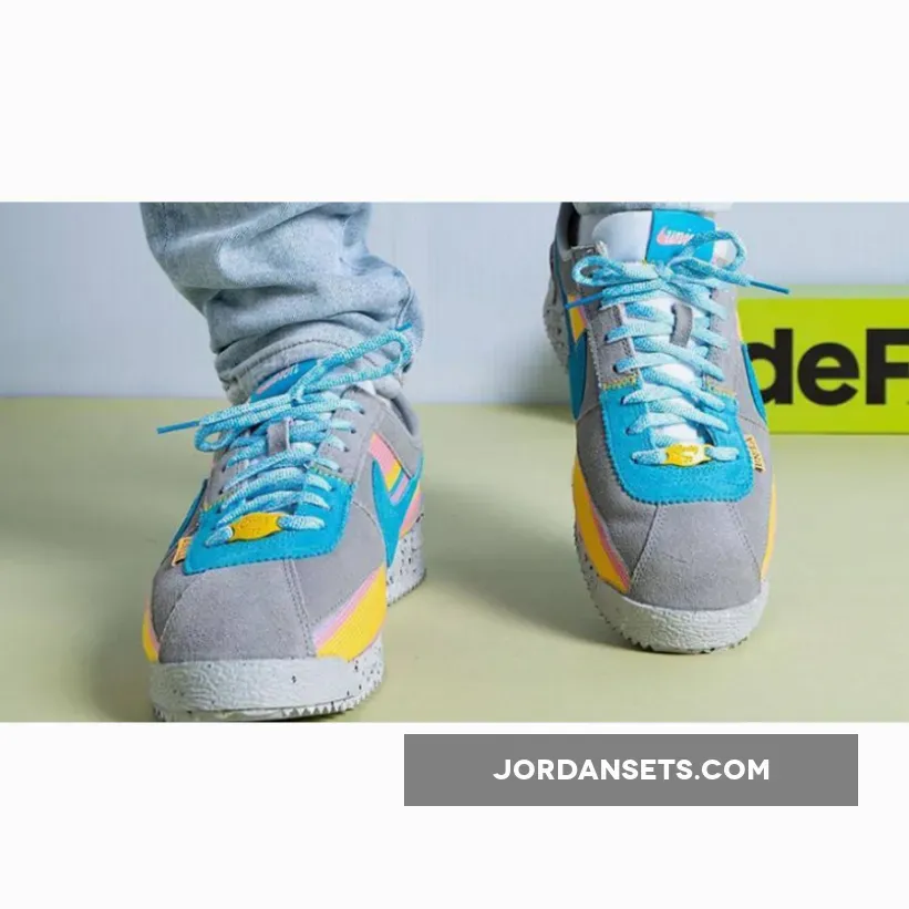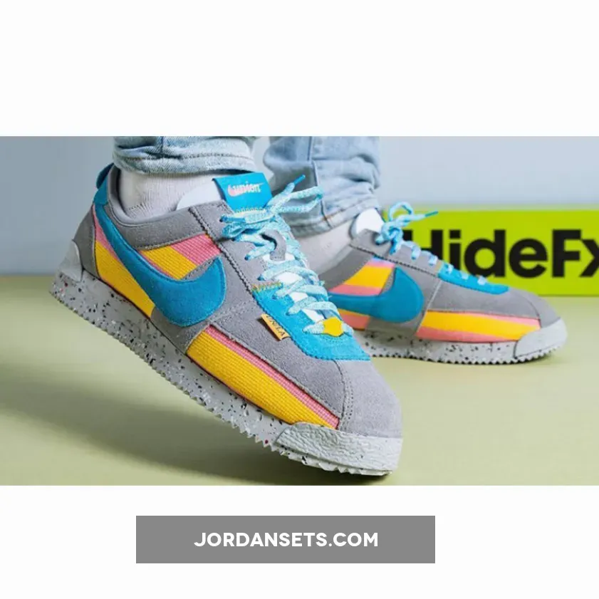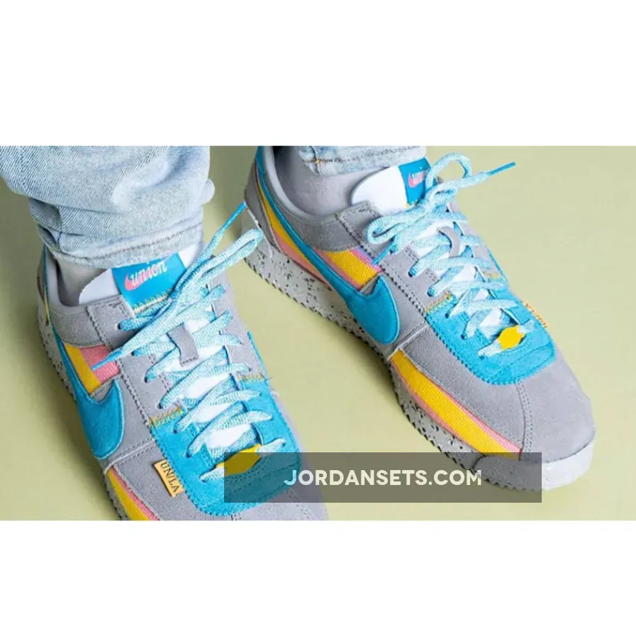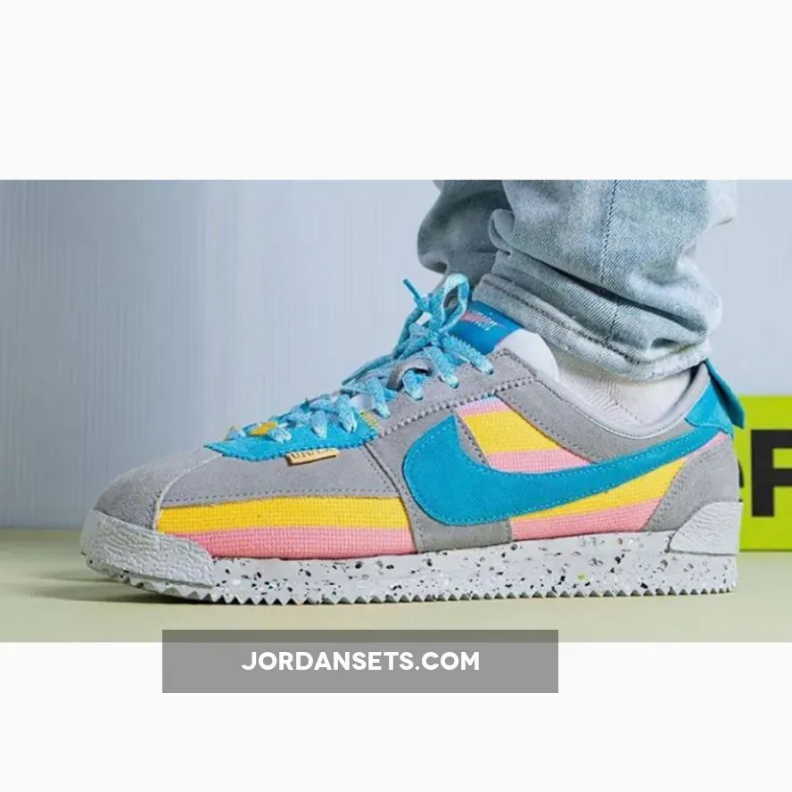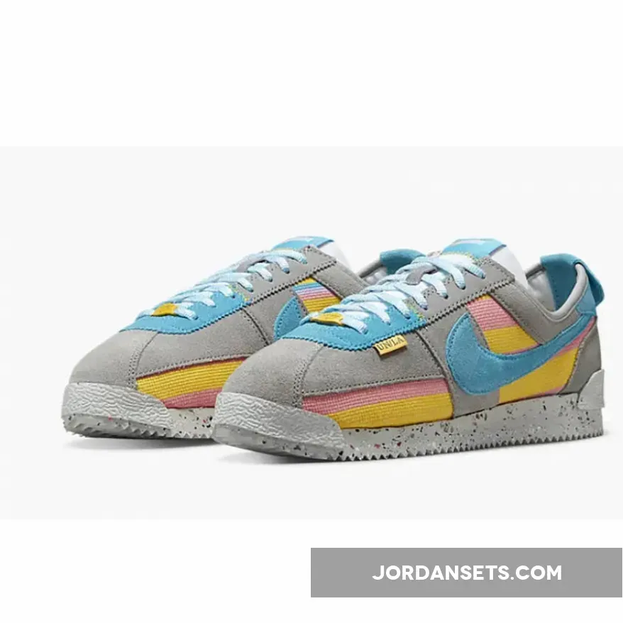 Cult clothing brand, Union LA, is collaborating with Nike to introduce a funky new collection. Check out the Union LA x Nike Cortez Grey Yellow. This running shoe is both bold and fun, showing off bright colours and experimenting with different materials. The upper begins with a canvas base with a woven finish, featuring vibrant yellow and pink stripes. Soft suede overlays in light grey wrap around the shoe. Bright blue suede profile Swooshes grace the mid-panel, matching part of the eyestay panel, the laces and the co-branded tongue label. Pops of yellow stand out on the leather lace tag and the “UN/LA” label hanging below the laces.