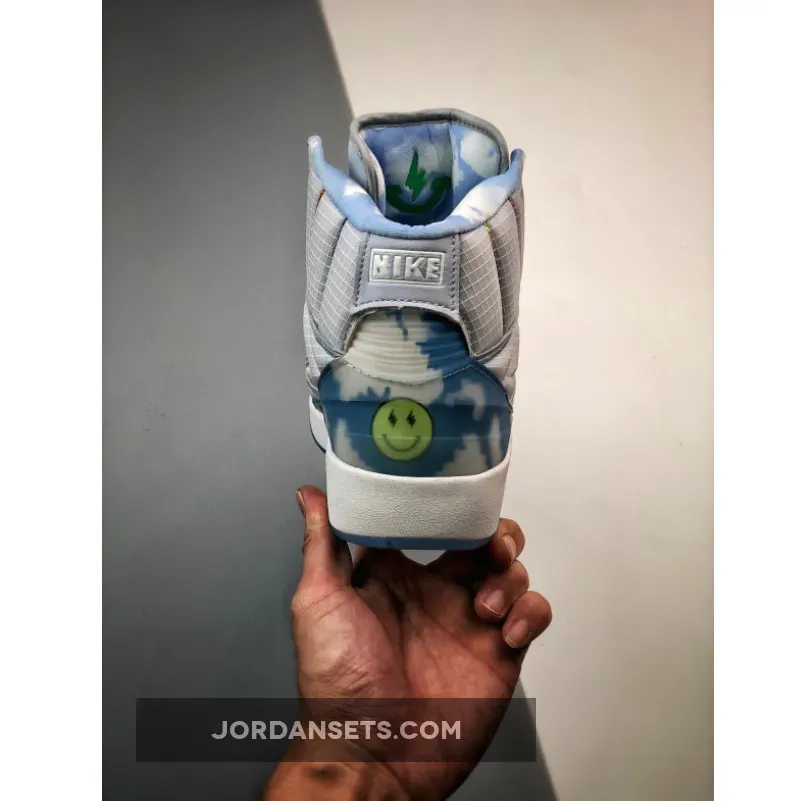 The J Balvin x Air Jordan 2 Retro delivers the Colombian reggaeton singer’s whimsical take on the legacy silhouette, featuring a powder blue ripstop upper with contrast multicolor stitching. A glow-in-the-dark Wings logo adorns the tongue, while an all-over graphic depicting cloudy blue skies decorates the interior lining and heel overlay. The latter is further accented with J Balvin’s signature smiley face graphic. Lightweight cushioning arrives via a crisp white polyurethane midsole, fitted with encapsulated Air-sole cushioning and supported by a translucent rubber outsole.